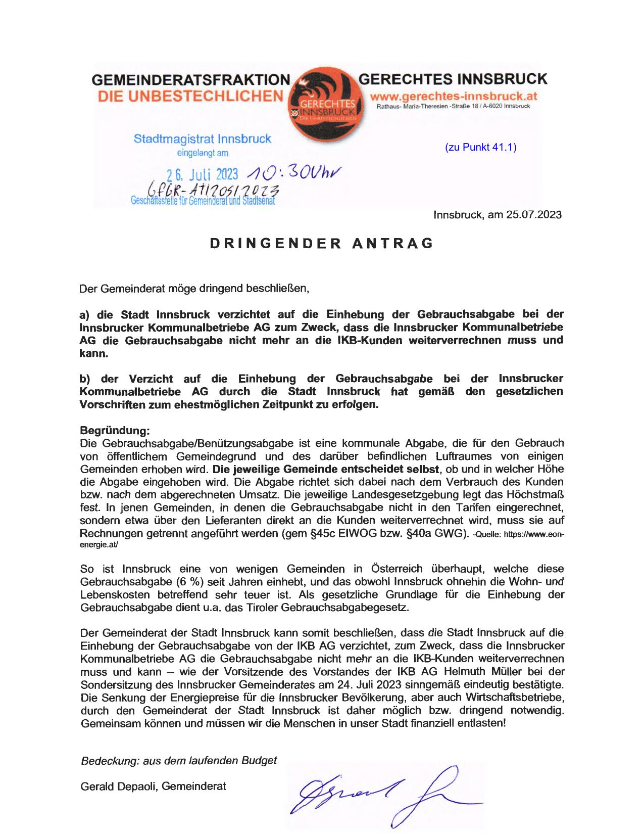 Sondersitzung des lnnsbrucker Gemeinderates am 24. Juli 2023 sinngemäß eindeutig bestätigte.
