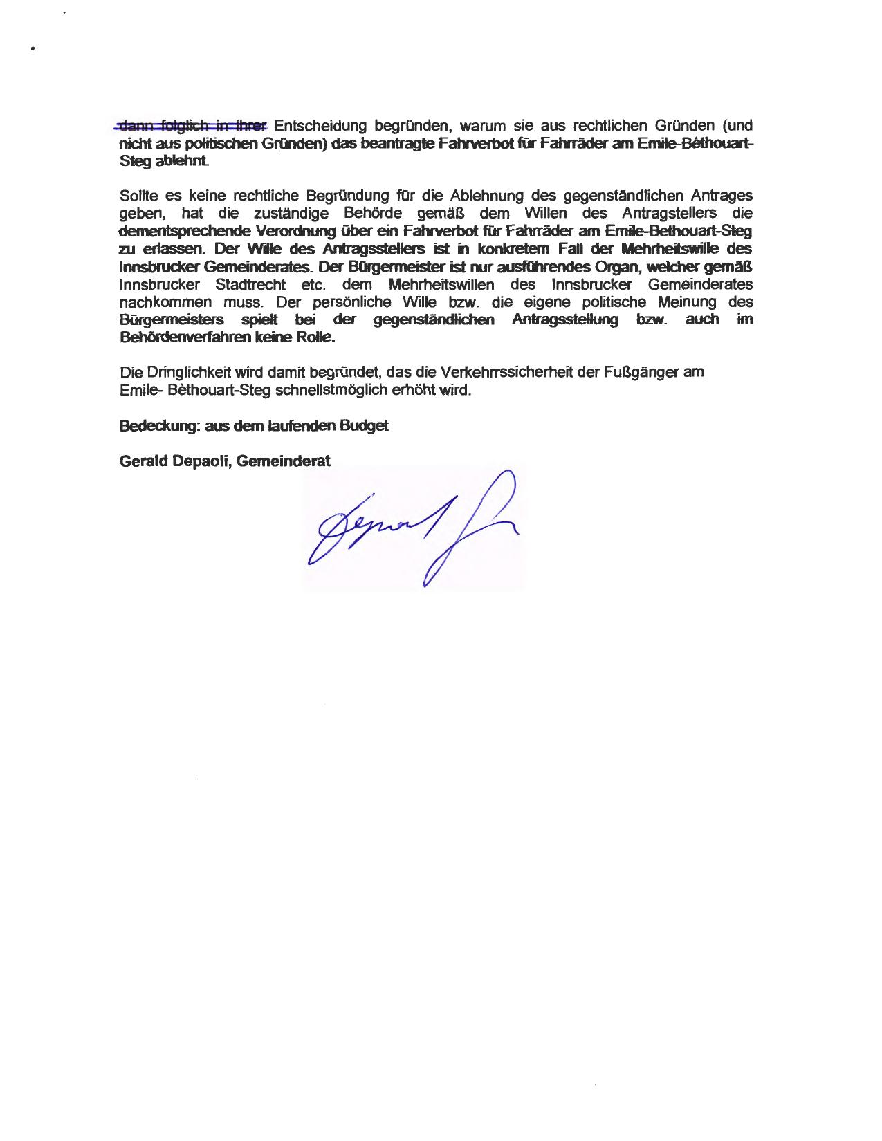 nicht aus politischen Gründen) das beantragte Fahrverbot für Fahrräder am Emile-BethouartSteg ablehnt.