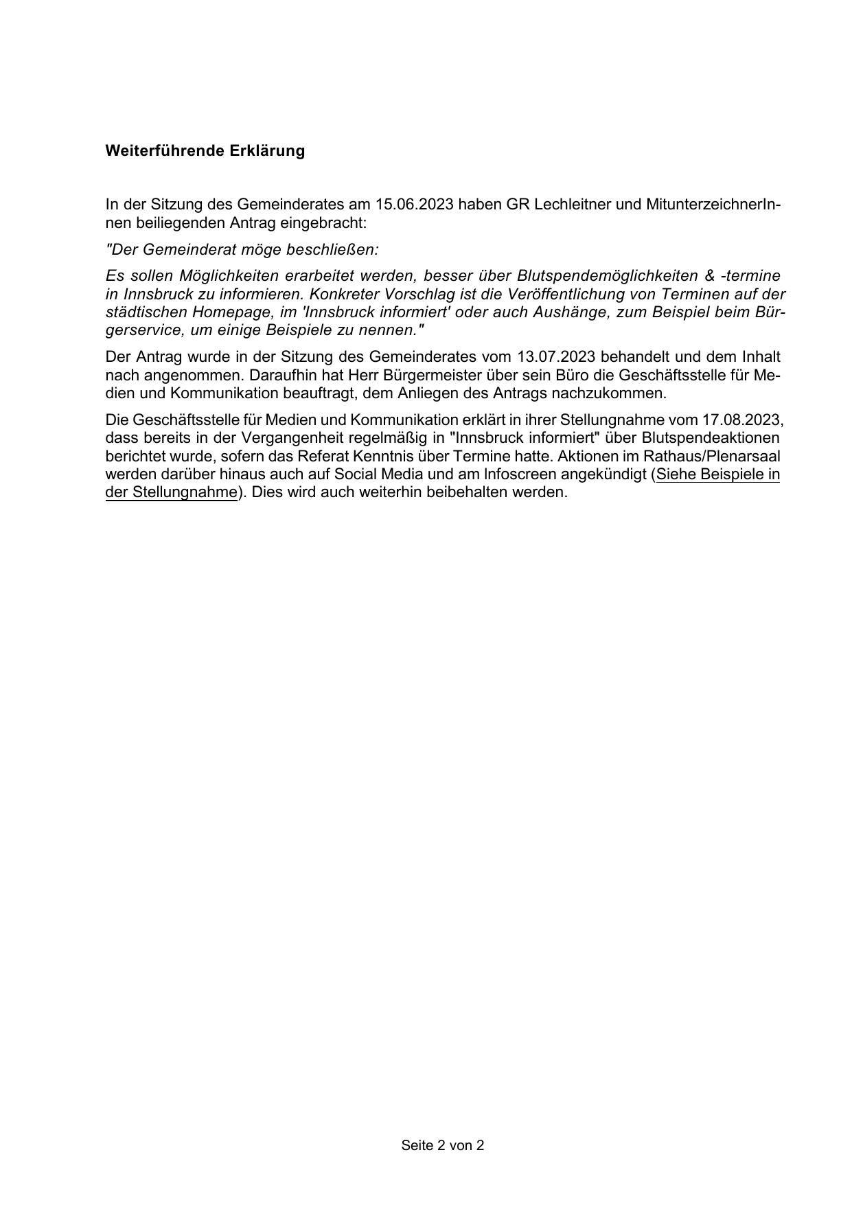 In der Sitzung des Gemeinderates am 15.06.2023 haben GR Lechleitner und MitunterzeichnerInnen beiliegenden Antrag eingebracht: