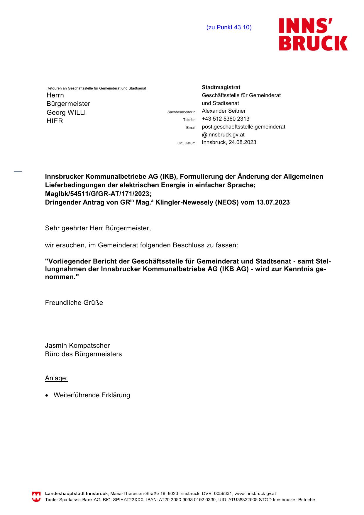 "Vorliegender Bericht der Geschäftsstelle für Gemeinderat und Stadtsenat - samt Stellungnahmen der Innsbrucker Kommunalbetriebe AG (IKB AG) - wird zur Kenntnis genommen."