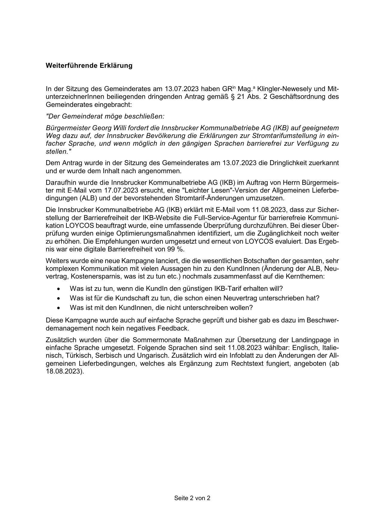 Daraufhin wurde die Innsbrucker Kommunalbetriebe AG (IKB) im Auftrag von Herrn Bürgermeister mit E-Mail vom 17.07.2023 ersucht, eine "Leichter Lesen"-Version der Allgemeinen Lieferbedingungen (ALB) und der bevorstehenden Stromtarif-Änderungen umzusetzen.