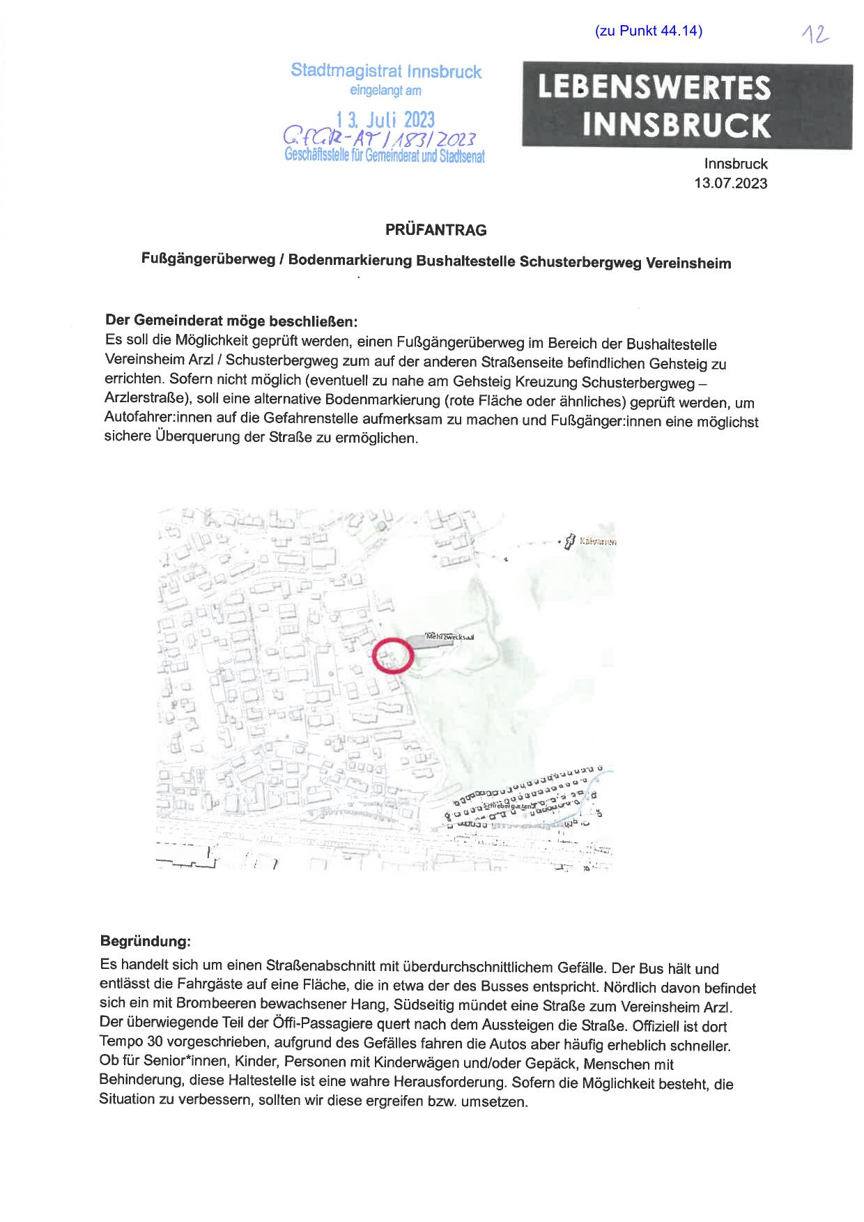 errichten. Sofern nicht möglich (eventuell zu nahe am Gehsteig Kreuzung Schusterbergweg Arzlerstraße), soll eine alternative Bodenmarkierung (rote Flächeoder ähnliches)geprüftwerden, um