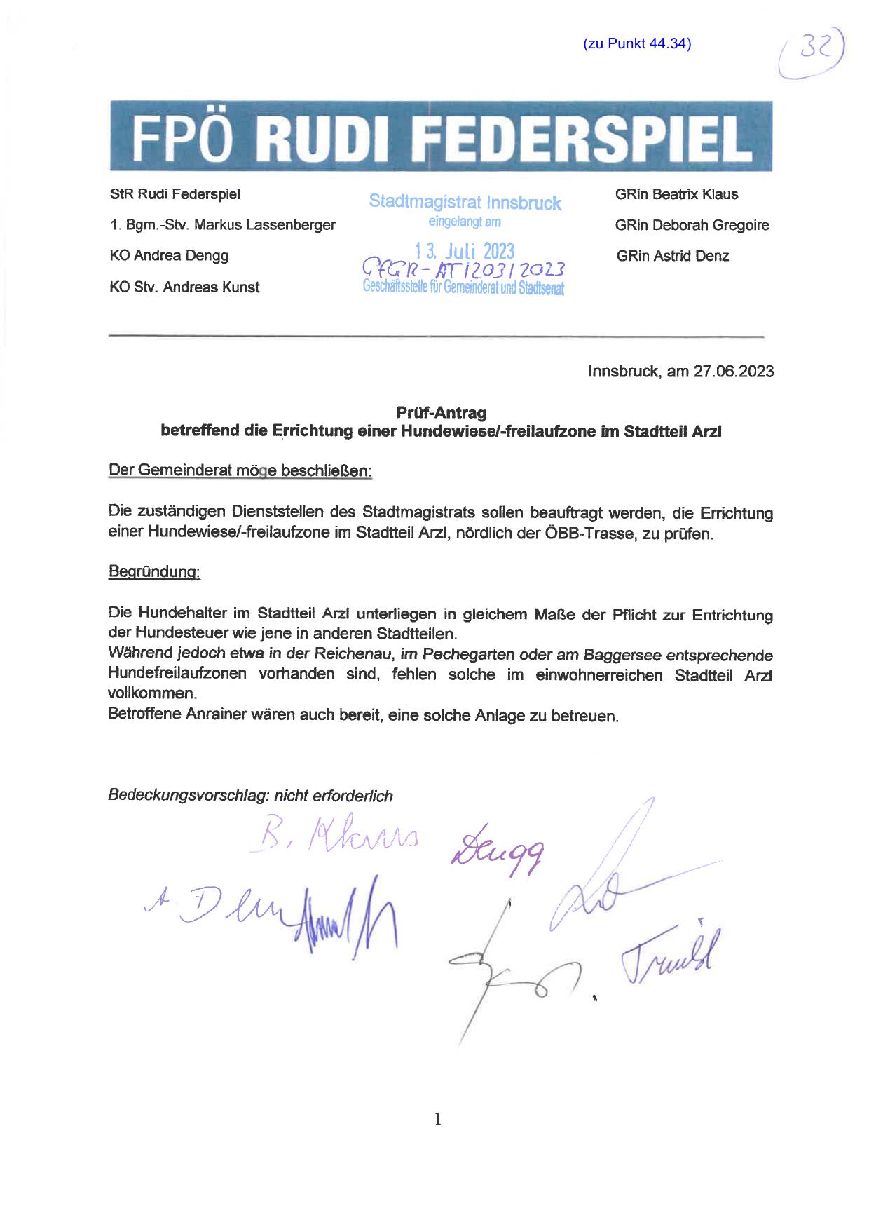 betreffend die Errichtung einer Hundewiese/-freilaufzone im Stadtteil Arzl