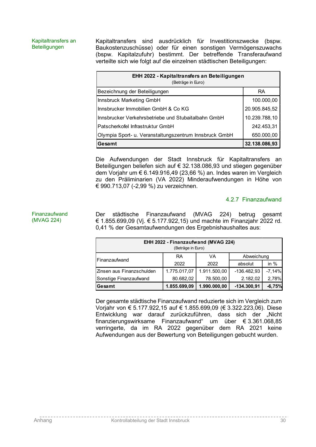 Die Aufwendungen der Stadt Innsbruck für Kapitaltransfers an