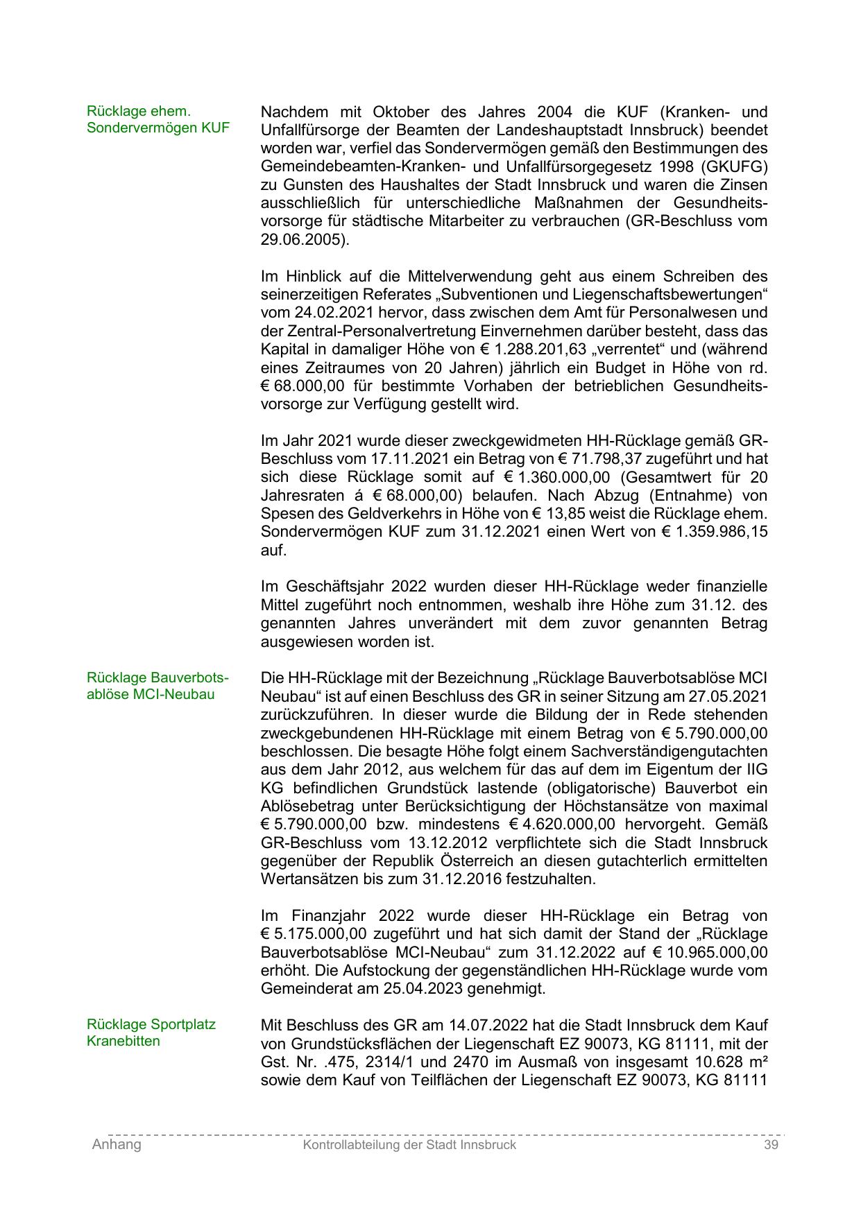 Im Jahr 2021 wurde dieser zweckgewidmeten HH-Rücklage gemäß GRBeschluss vom 17.11.2021 ein Betrag von € 71.798,37 zugeführt und hat