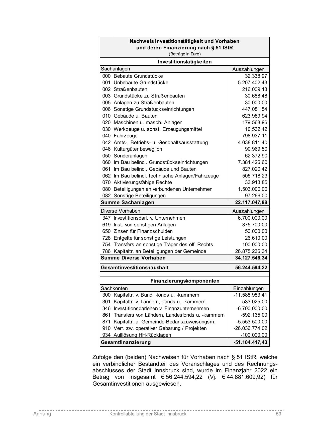 ein verbindlicher Bestandteil des Voranschlages und des Rechnungsabschlusses der Stadt Innsbruck sind, wurde im Finanzjahr 2022 ein