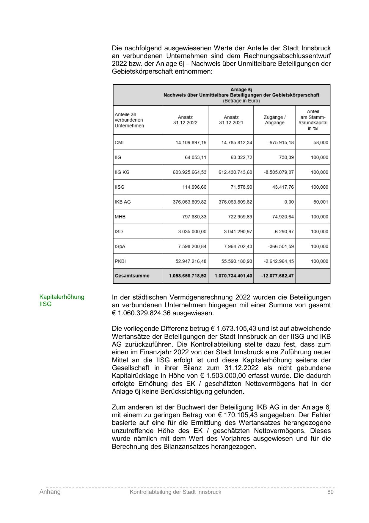 Wertansätze der Beteiligungen der Stadt Innsbruck an der IISG und IKB