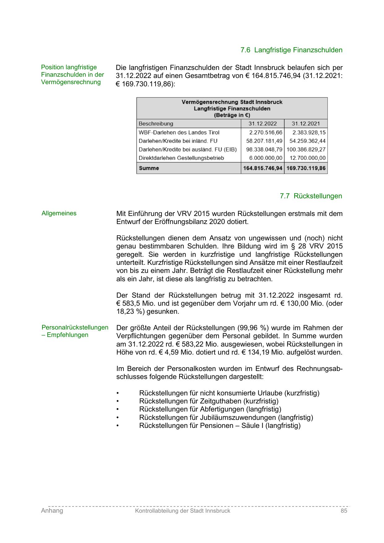 Im Bereich der Personalkosten wurden im Entwurf des Rechnungsabschlusses folgende Rückstellungen dargestellt: