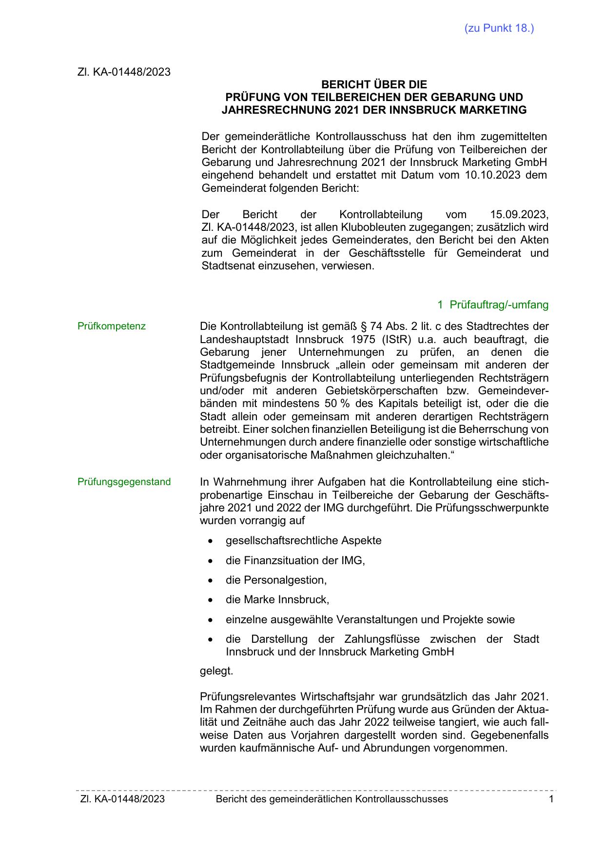 In Wahrnehmung ihrer Aufgaben hat die Kontrollabteilung eine stichprobenartige Einschau in Teilbereiche der Gebarung der Geschäftsjahre 2021 und 2022 der IMG durchgeführt. Die Prüfungsschwerpunkte