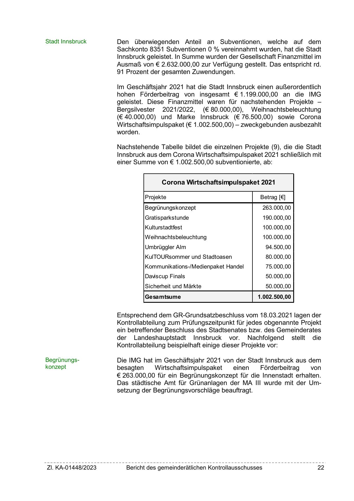 Die IMG hat im Geschäftsjahr 2021 von der Stadt Innsbruck aus dem
