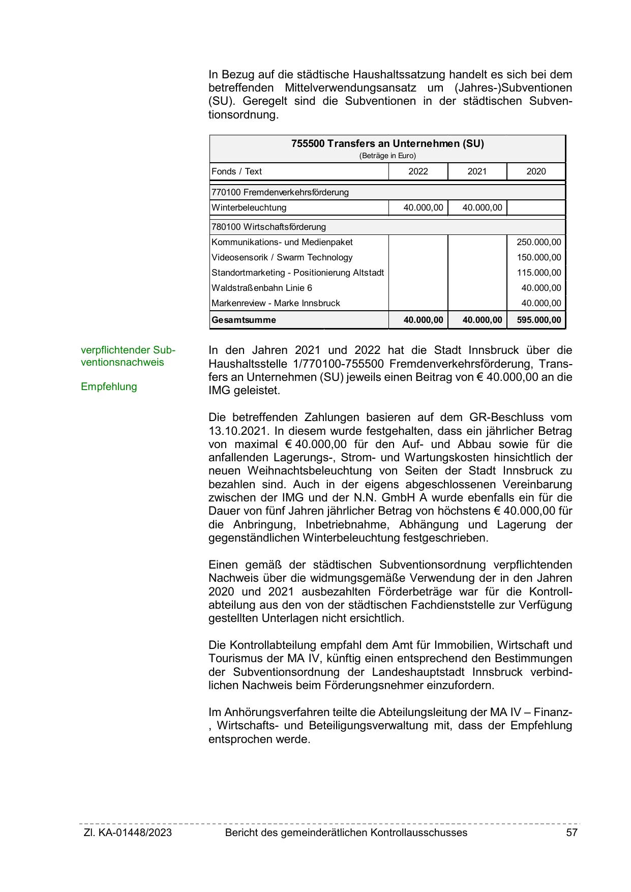 der Subventionsordnung der Landeshauptstadt Innsbruck verbindlichen Nachweis beim Förderungsnehmer einzufordern.