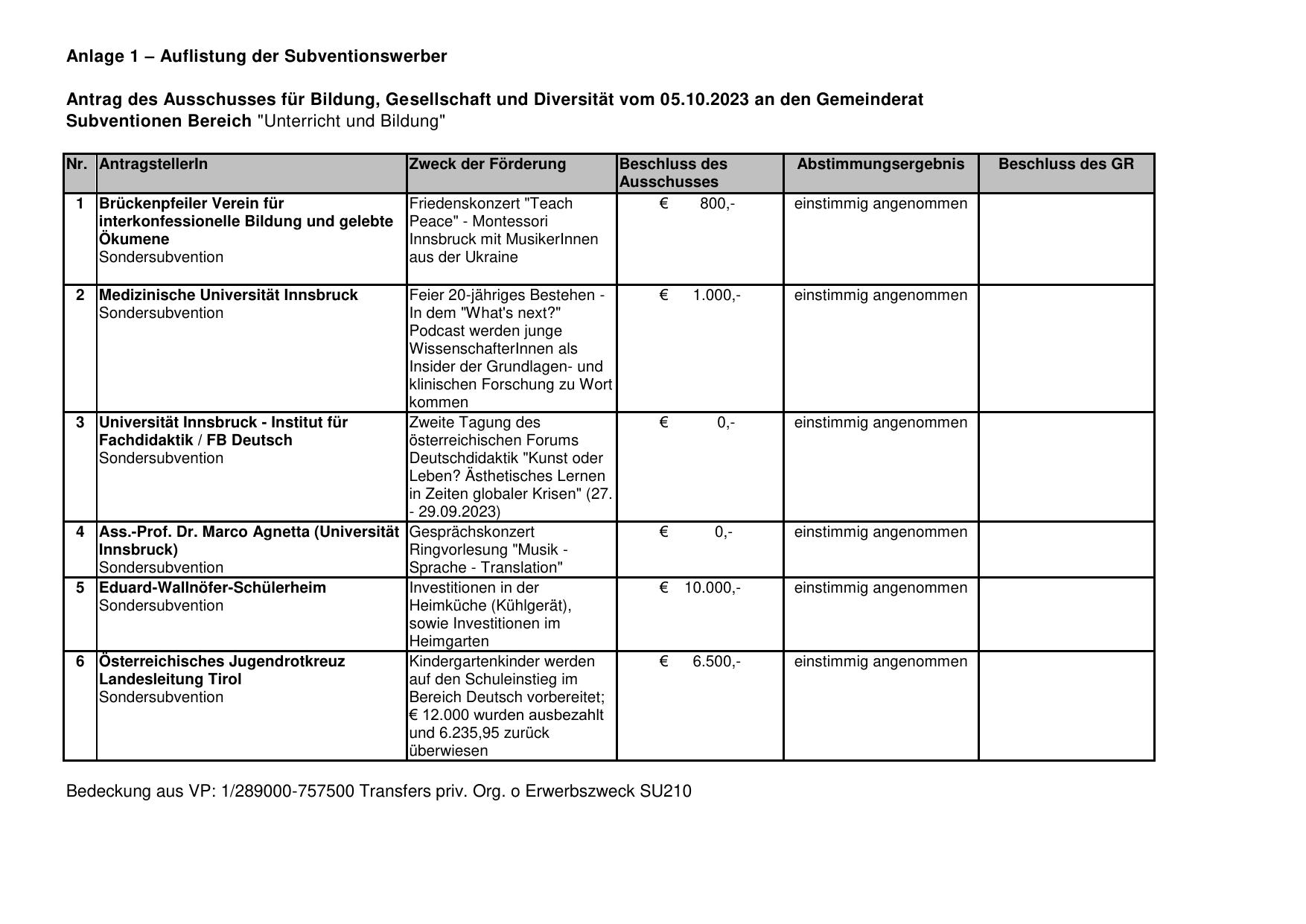 Bedeckung aus VP: 1/289000-757500 Transfers priv. Org. o Erwerbszweck SU210