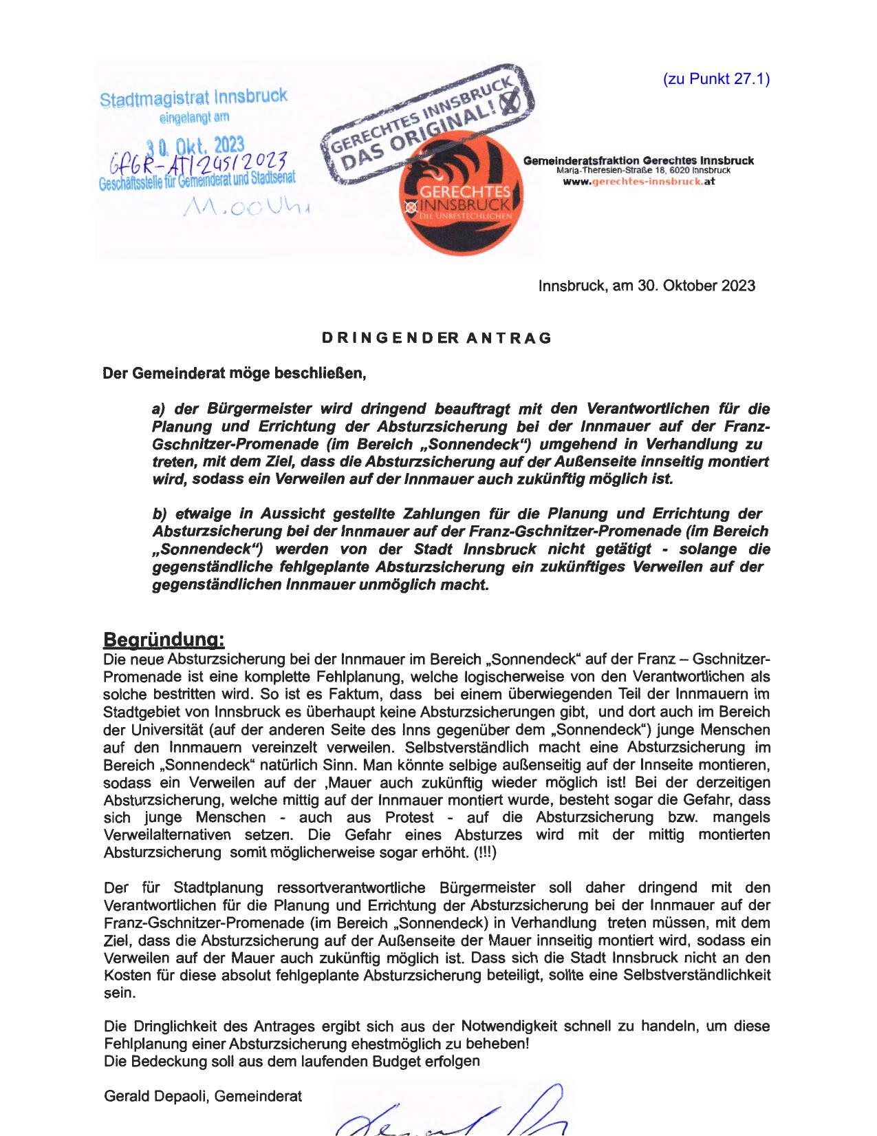 Planung und Errichtung der Absturzsicherung bei der lnnmauer auf der FranzGschnitzer-Promenade (im Bereich „Sonnendeck"? umgehend in Verhandlung zu