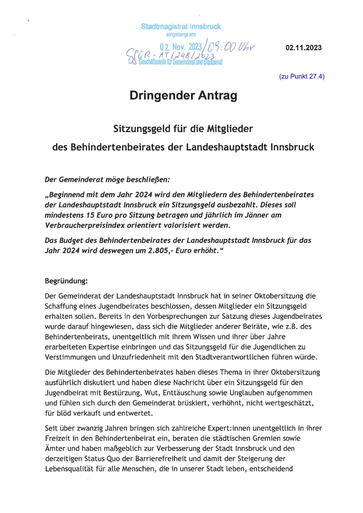 der Landeshauptstadt Innsbruck ein Sitzungsgeld ausbezahlt. Dieses soll