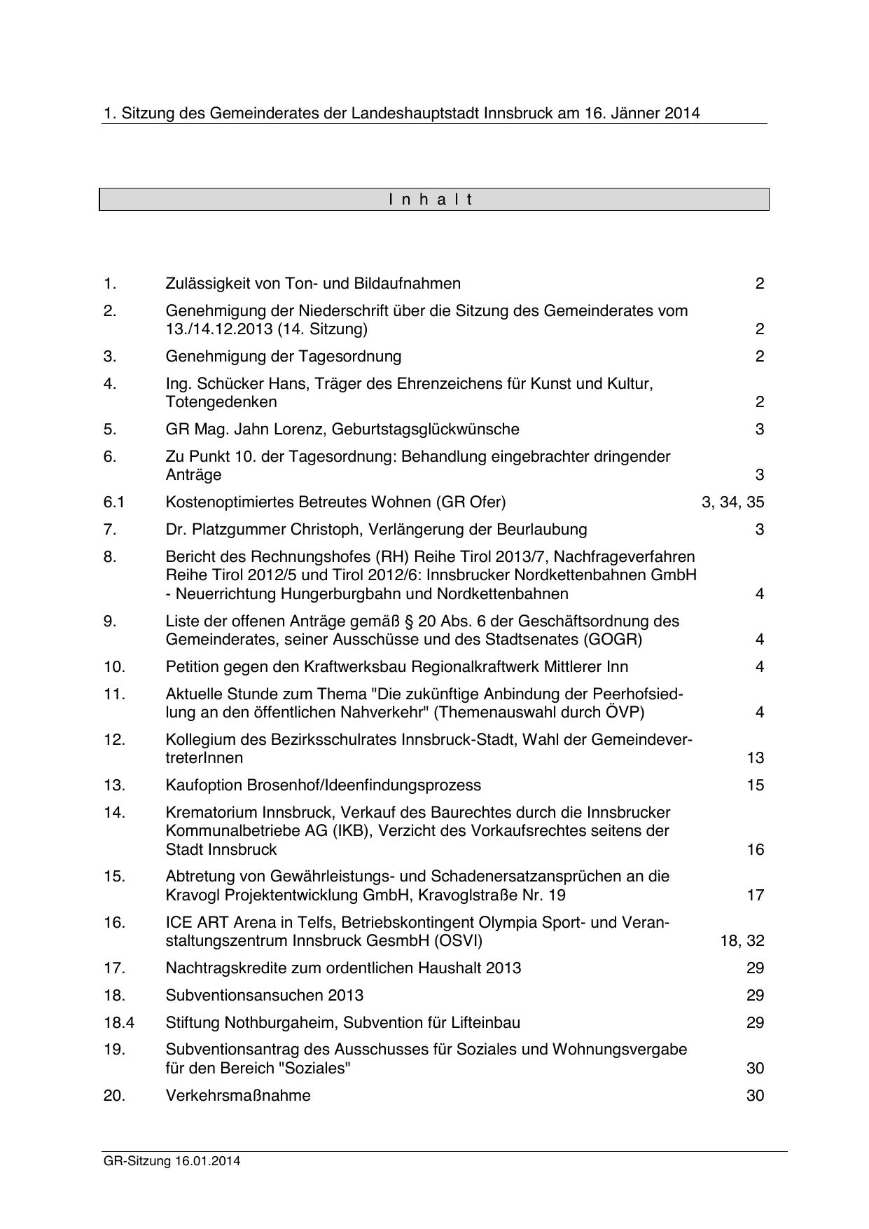 1. Sitzung des Gemeinderates der Landeshauptstadt Innsbruck am 16. Jänner 2014