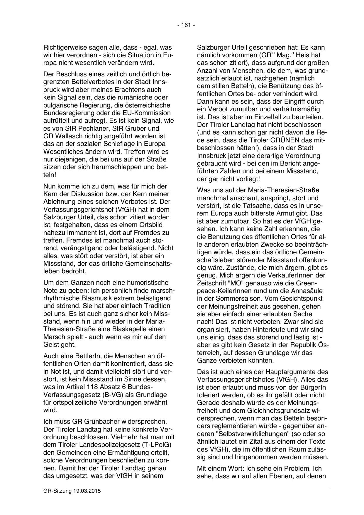 Der Beschluss eines zeitlich und örtlich begrenzten Bettelverbotes in der Stadt Innsbruck wird aber meines Erachtens auch