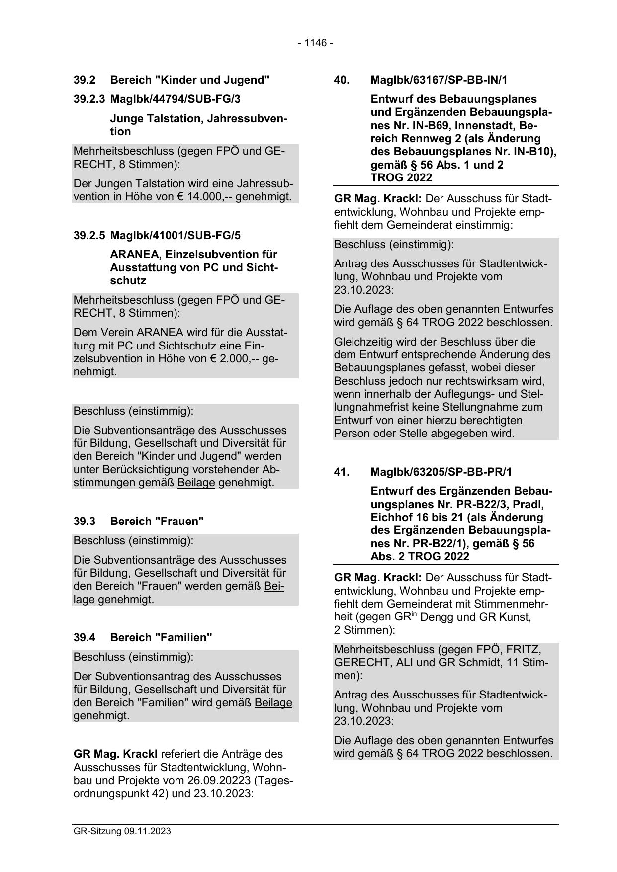 Mehrheitsbeschluss (gegen FPÖ und GERECHT, 8 Stimmen):