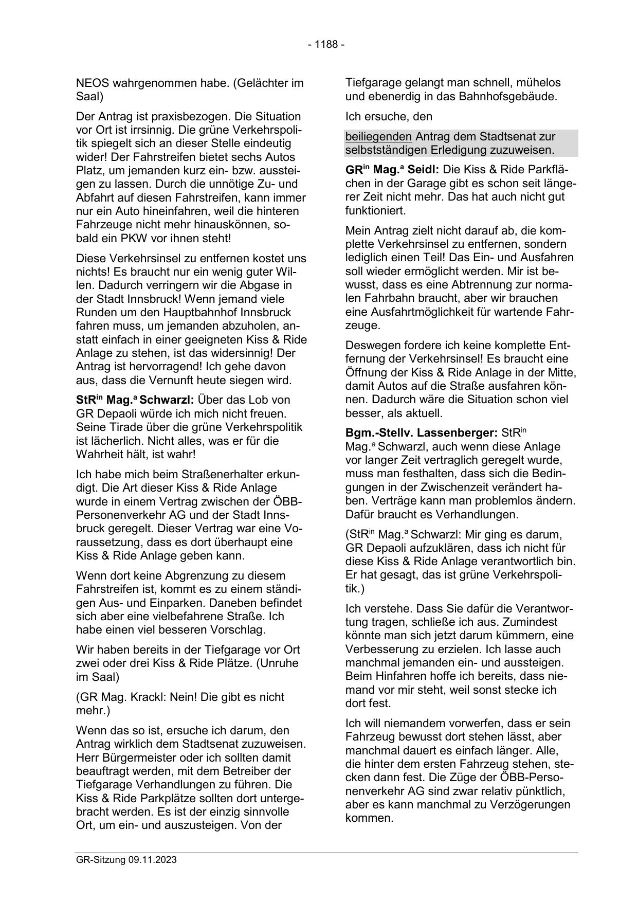 GRin Mag.a Seidl: Die Kiss & Ride Parkflächen in der Garage gibt es schon seit längerer Zeit nicht mehr. Das hat auch nicht gut