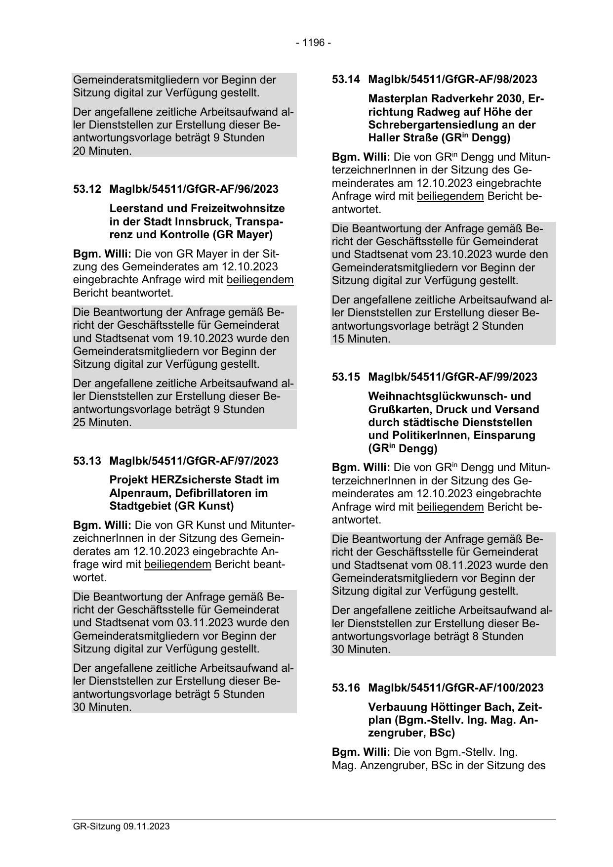 Bgm. Willi: Die von GR Kunst und MitunterzeichnerInnen in der Sitzung des Gemeinderates am 12.10.2023 eingebrachte Anfrage wird mit beiliegendem Bericht beantwortet.