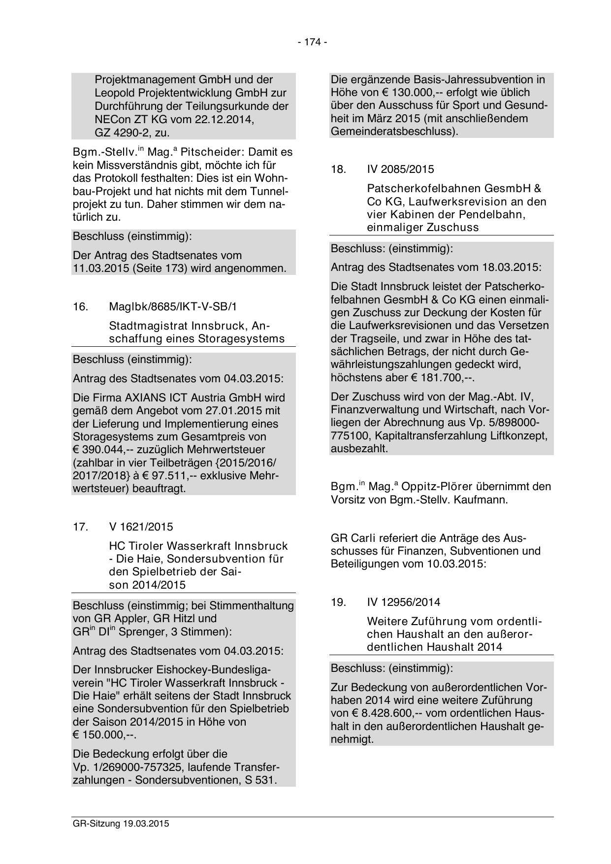 Die Stadt Innsbruck leistet der Patscherkofelbahnen GesmbH & Co KG einen einmaligen Zuschuss zur Deckung der Kosten für