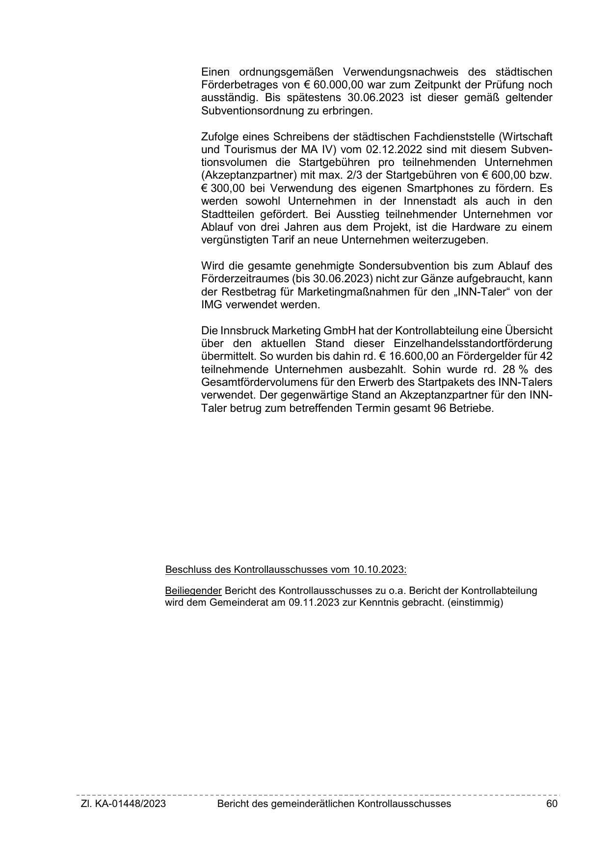 Beschluss des Kontrollausschusses vom 10.10.2023:
