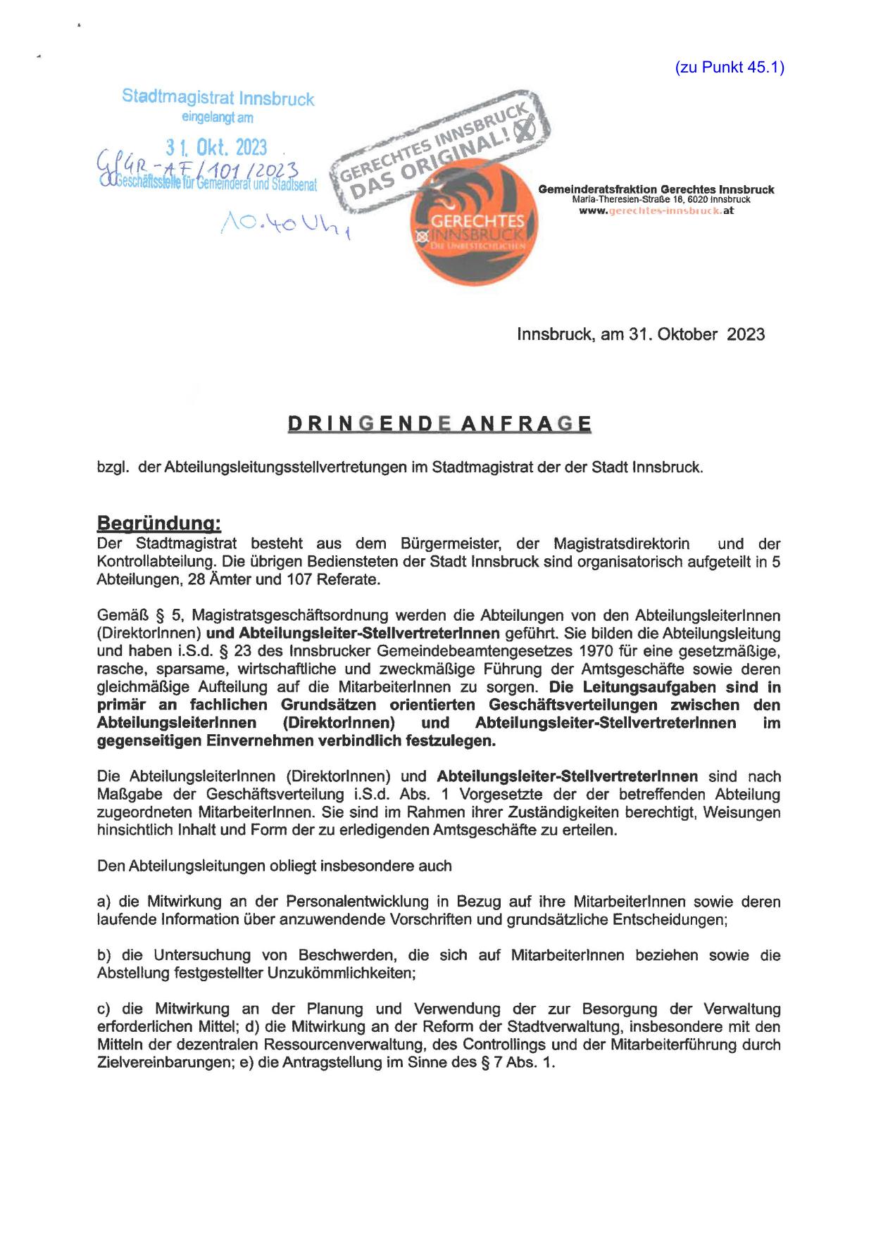 bzgl. der Abteilungsleitungsstellvertretungen im Stadtmagistrat der der Stadt Innsbruck.