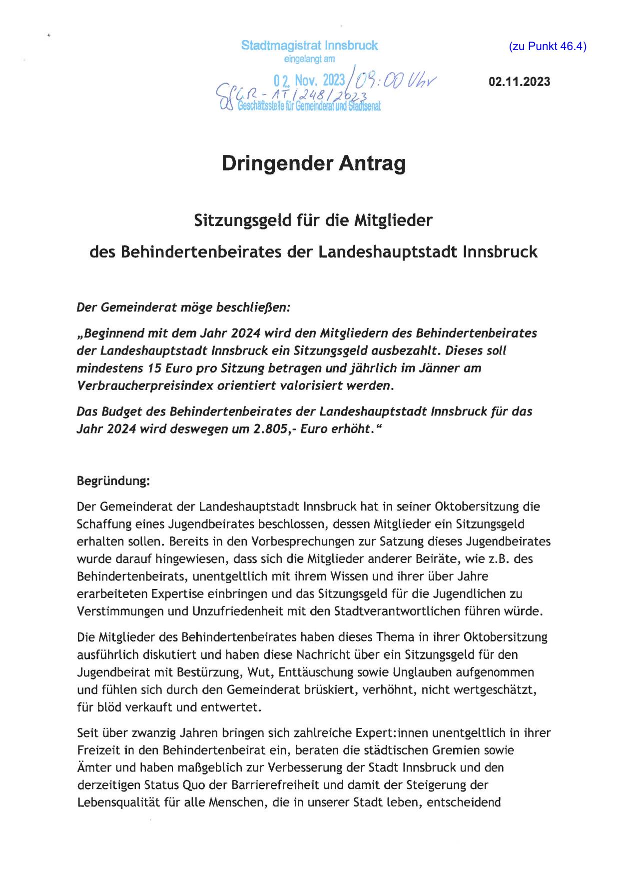 der Landeshauptstadt Innsbruck ein Sitzungsgeld ausbezahlt. Dieses soll