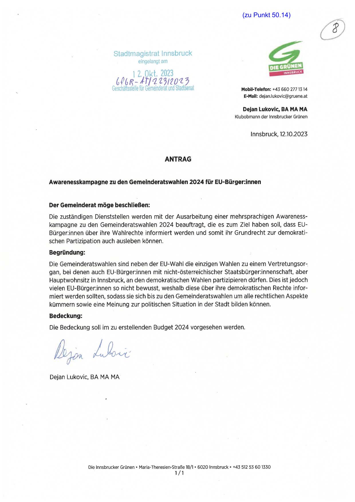 Die zuständigen Dienststellen werden mit der Ausarbeitung einer mehrsprachigen Awarenesskampagne zu den Gemeinderatswahlen 2024 beauftragt, die es zum Ziel haben soll, dass EUBürger:innen über ihre Wahlrechte informiert werden und somit ihr Grundrecht zur demokratischen Partizipation auch ausleben können.