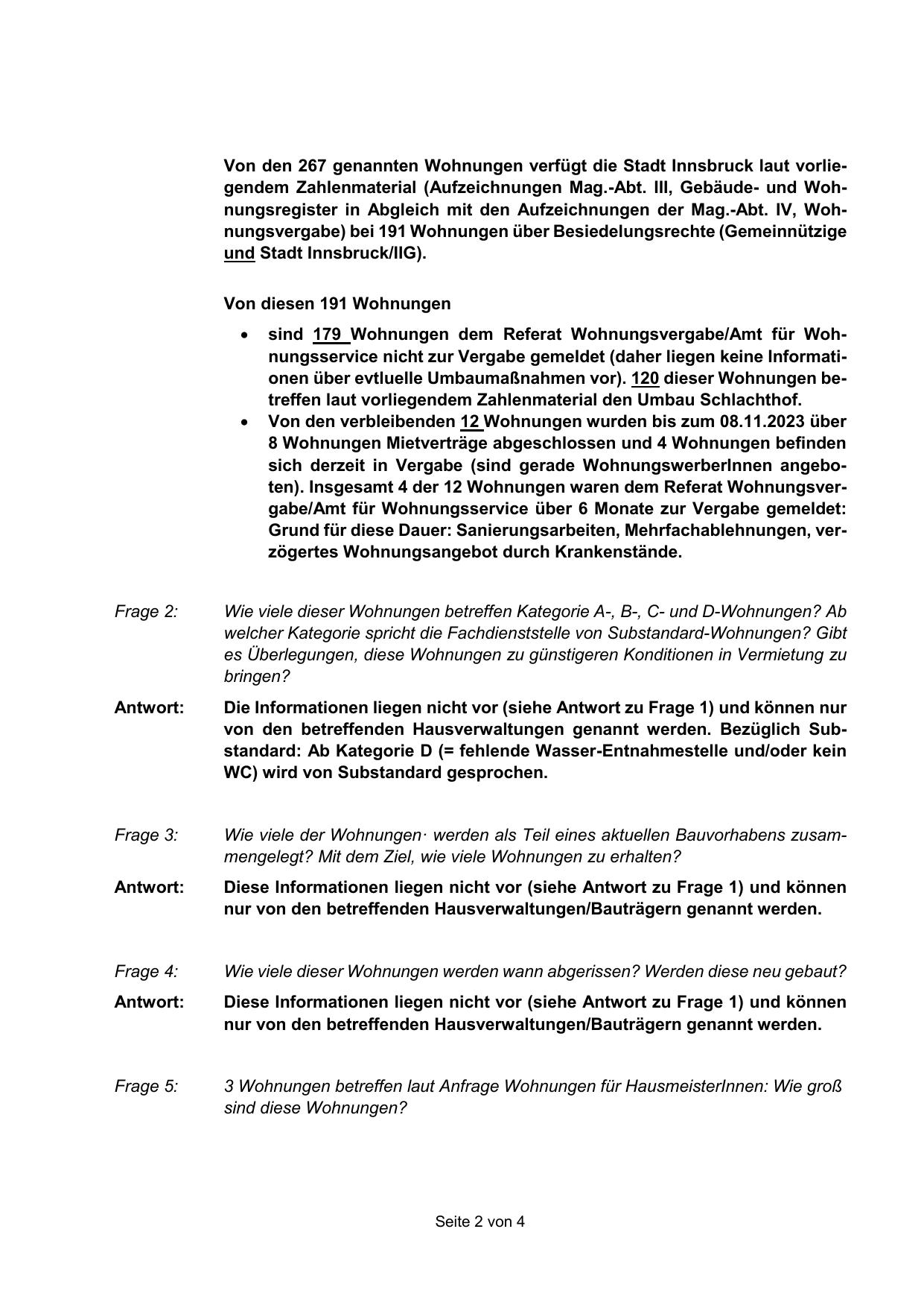 Von den 267 genannten Wohnungen verfügt die Stadt Innsbruck laut vorliegendem Zahlenmaterial (Aufzeichnungen Mag.-Abt. III, Gebäude- und Wohnungsregister in Abgleich mit den Aufzeichnungen der Mag.-Abt. IV, Wohnungsvergabe) bei 191 Wohnungen über Besiedelungsrechte (Gemeinnützige