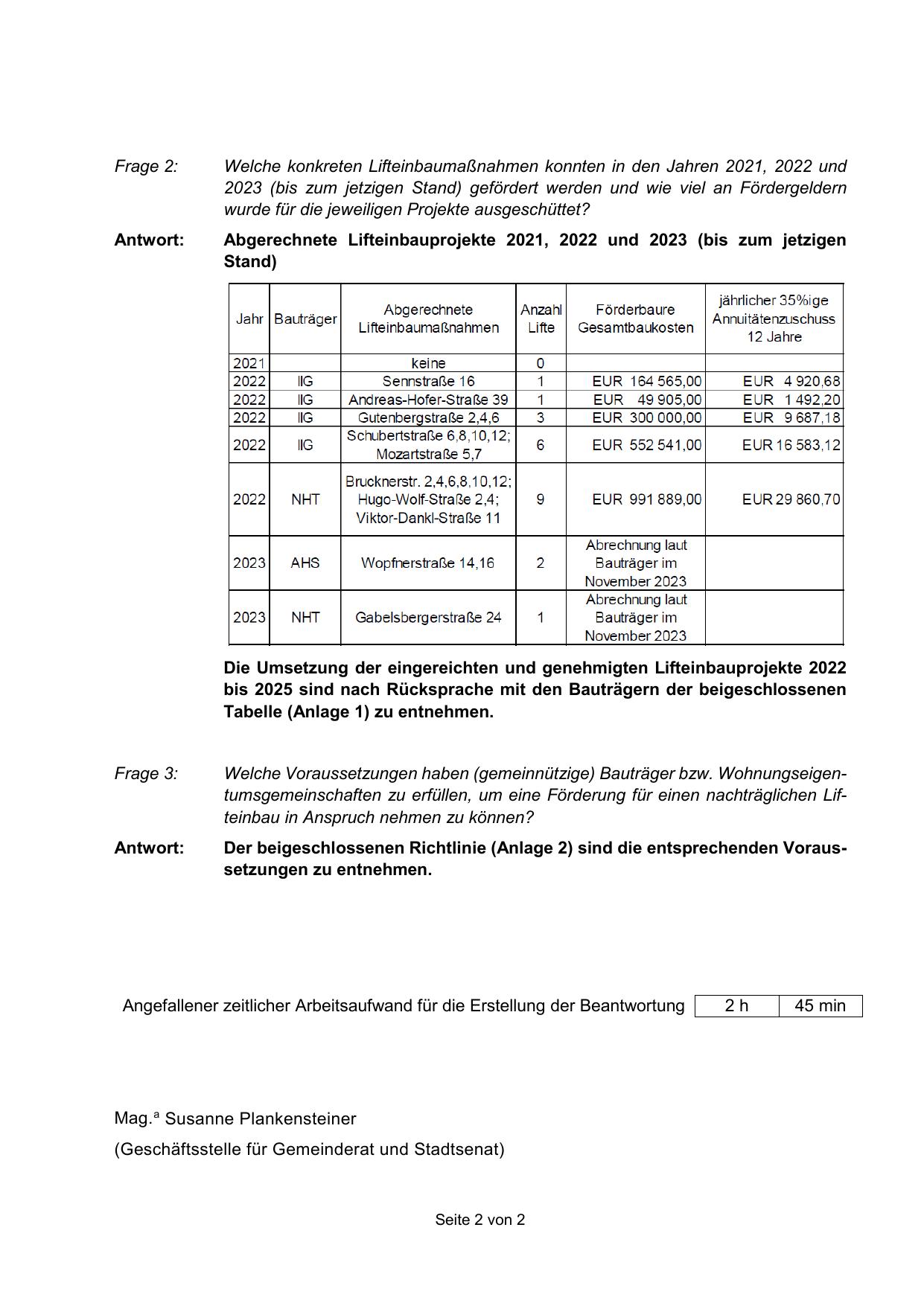Abgerechnete Lifteinbauprojekte 2021, 2022 und 2023 (bis zum jetzigen