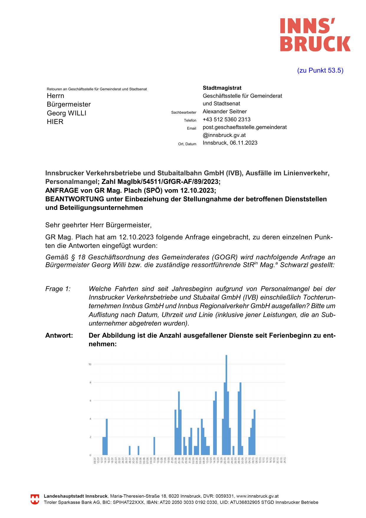Innsbrucker Verkehrsbetriebe und Stubaital GmbH (IVB) einschließlich Tochterunternehmen Innbus GmbH und Innbus Regionalverkehr GmbH ausgefallen? Bitte um