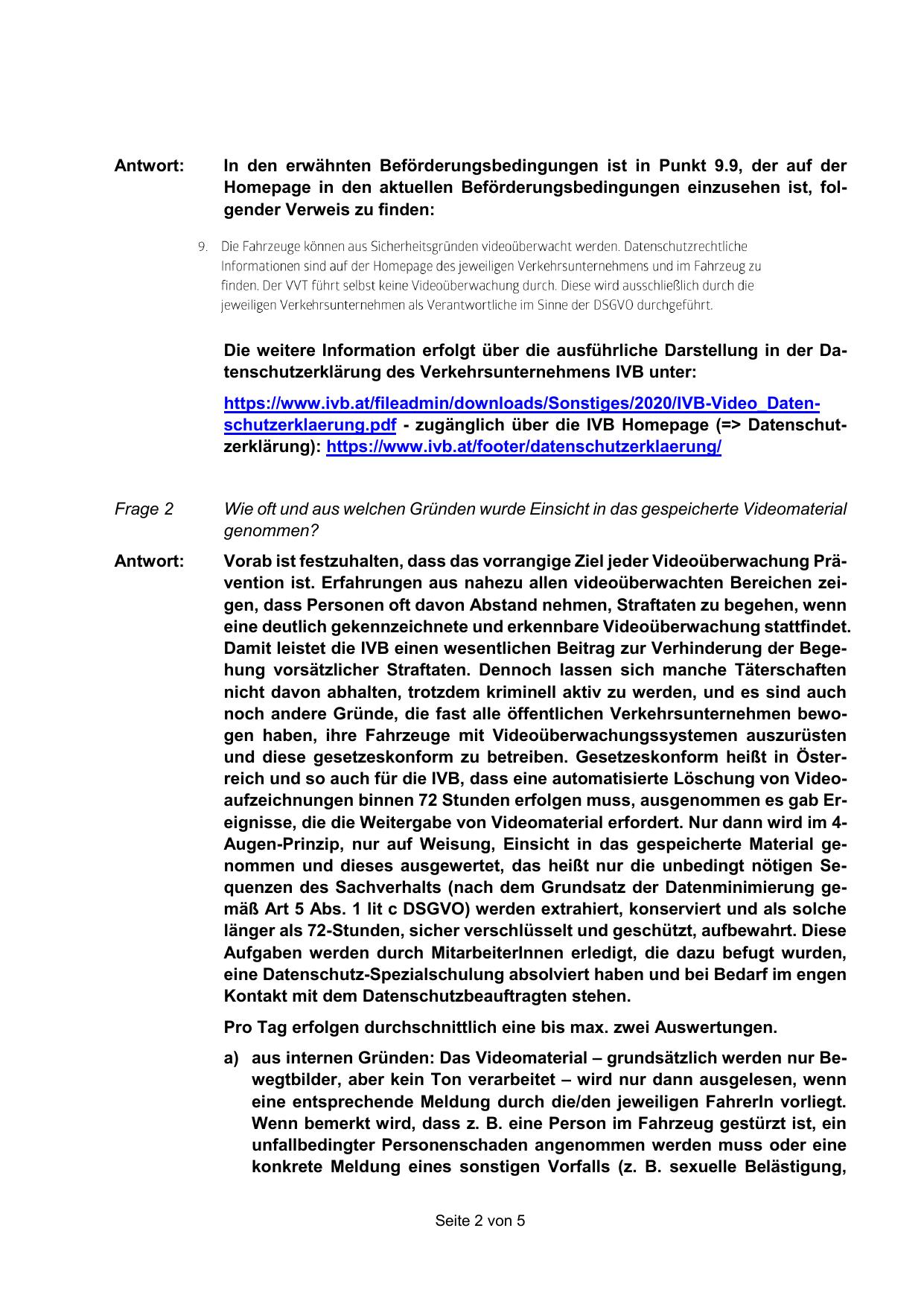 und diese gesetzeskonform zu betreiben. Gesetzeskonform heißt in Österreich und so auch für die IVB, dass eine automatisierte Löschung von Videoaufzeichnungen binnen 72 Stunden erfolgen muss, ausgenommen es gab Ereignisse, die die Weitergabe von Videomaterial erfordert. Nur dann wird im 4Augen-Prinzip, nur auf Weisung, Einsicht in das gespeicherte Material genommen und dieses ausgewertet, das heißt nur die unbedingt nötigen Sequenzen des Sachverhalts (nach dem Grundsatz der Datenminimierung gemäß Art 5 Abs. 1 lit c DSGVO) werden extrahiert, konserviert und als solche