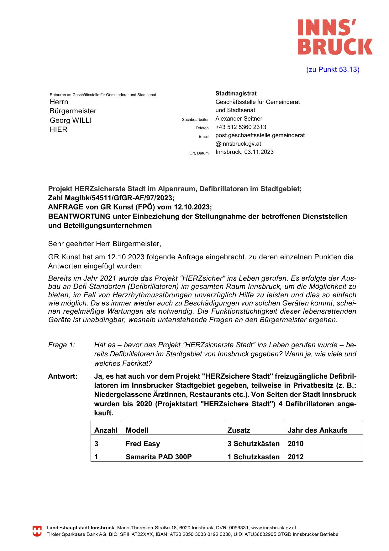 Bereits im Jahr 2021 wurde das Projekt "HERZsicher" ins Leben gerufen. Es erfolgte der Ausbau an Defi-Standorten (Defibrillatoren) im gesamten Raum Innsbruck, um die Möglichkeit zu
