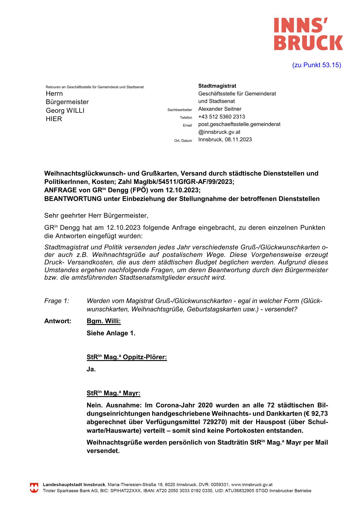 GRin Dengg hat am 12.10.2023 folgende Anfrage eingebracht, zu deren einzelnen Punkten