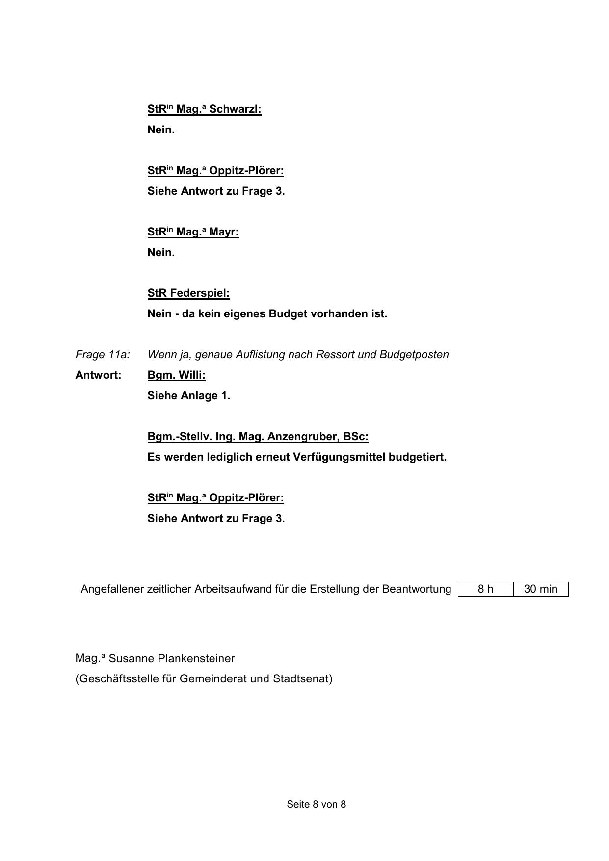 Angefallener zeitlicher Arbeitsaufwand für die Erstellung der Beantwortung