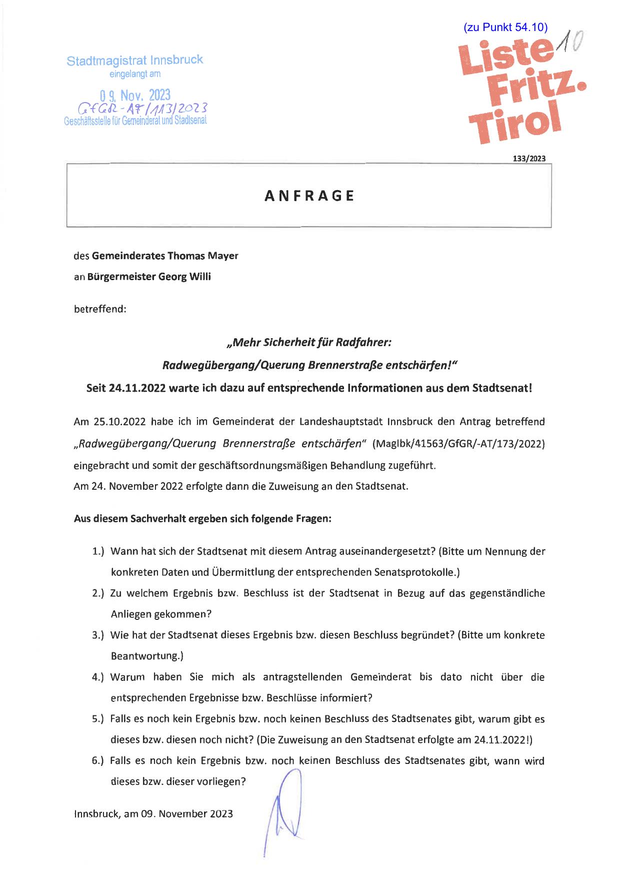 "Radwegübergang/Querung Brennerstraße entschärfen" (Maglbk/41563/GfGR/-AT/173/2022)