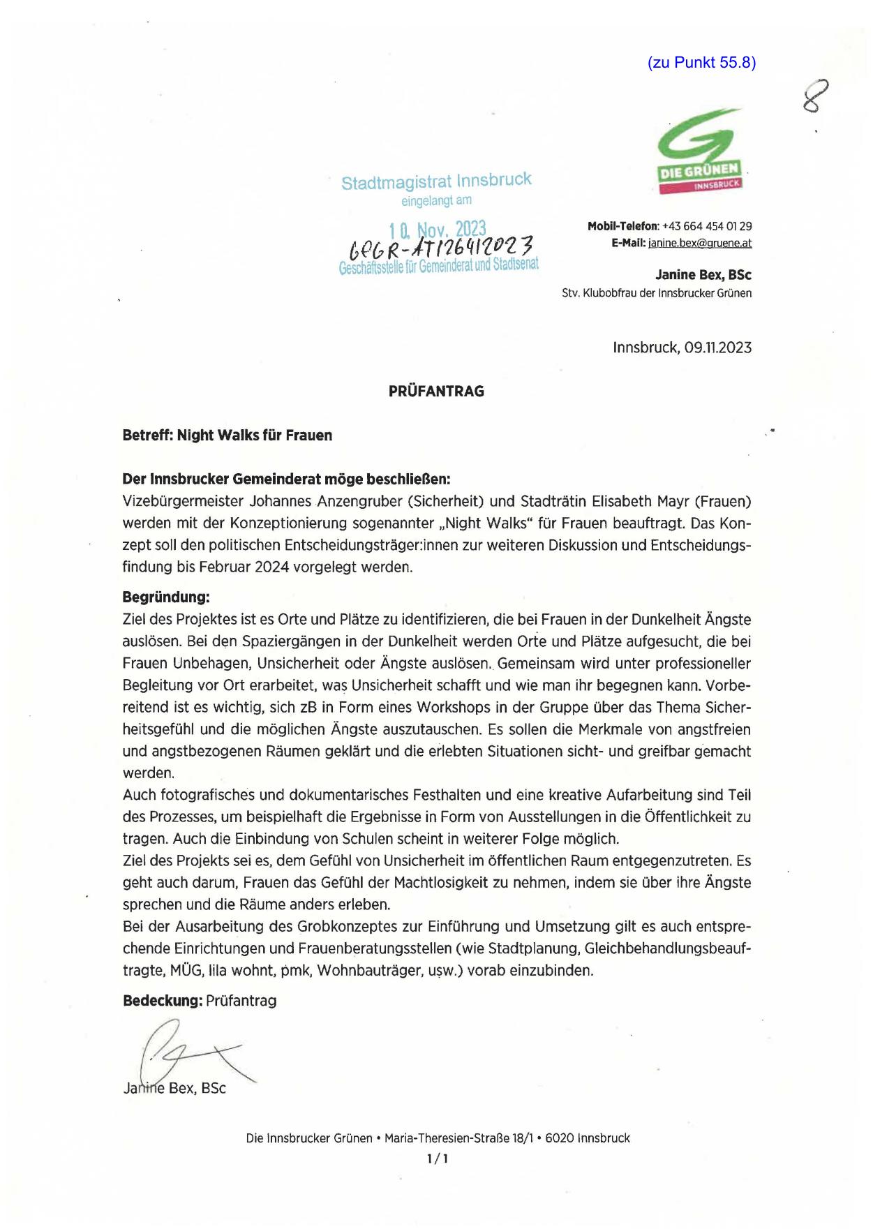 werden mit der Konzeptionierung sogenannter „Night Walks" für Frauen beauftragt. Das Konzept soll den politischen Entscheidungsträger:innen zur weiteren Diskussion und Entscheidungsfindung bis Februar 2024 vorgelegt werden.