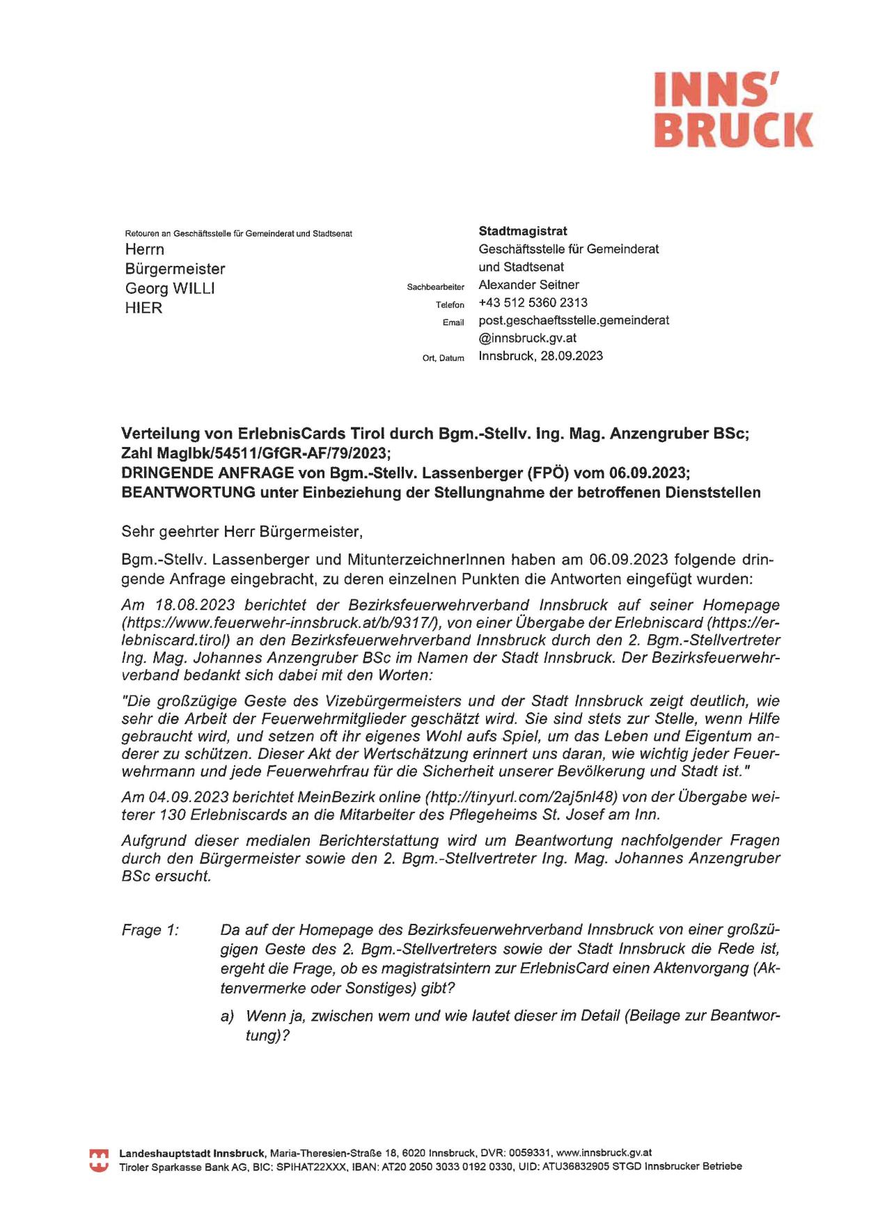 (https://www.feuerwehr-innsbruck. atlb/9317/), von einer Übergabe der Erlebniscard (https:/lerlebniscard. tirol) an den Bezirksfeuerwehrverband Innsbruck durch den 2. Bgm.-Stellvertreter