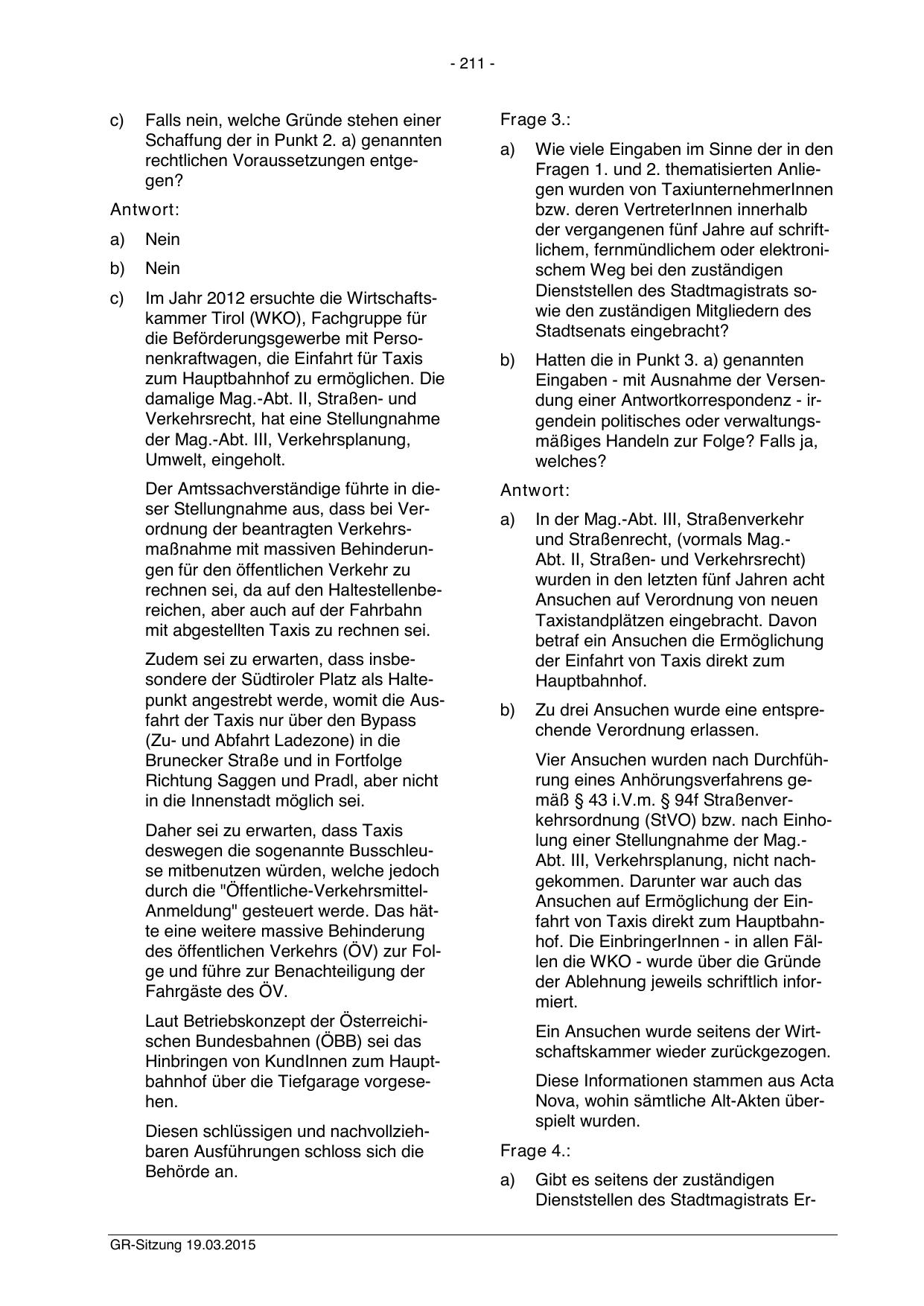 Ansuchen auf Ermöglichung der Einfahrt von Taxis direkt zum Hauptbahnhof. Die EinbringerInnen - in allen Fällen die WKO - wurde über die Gründe