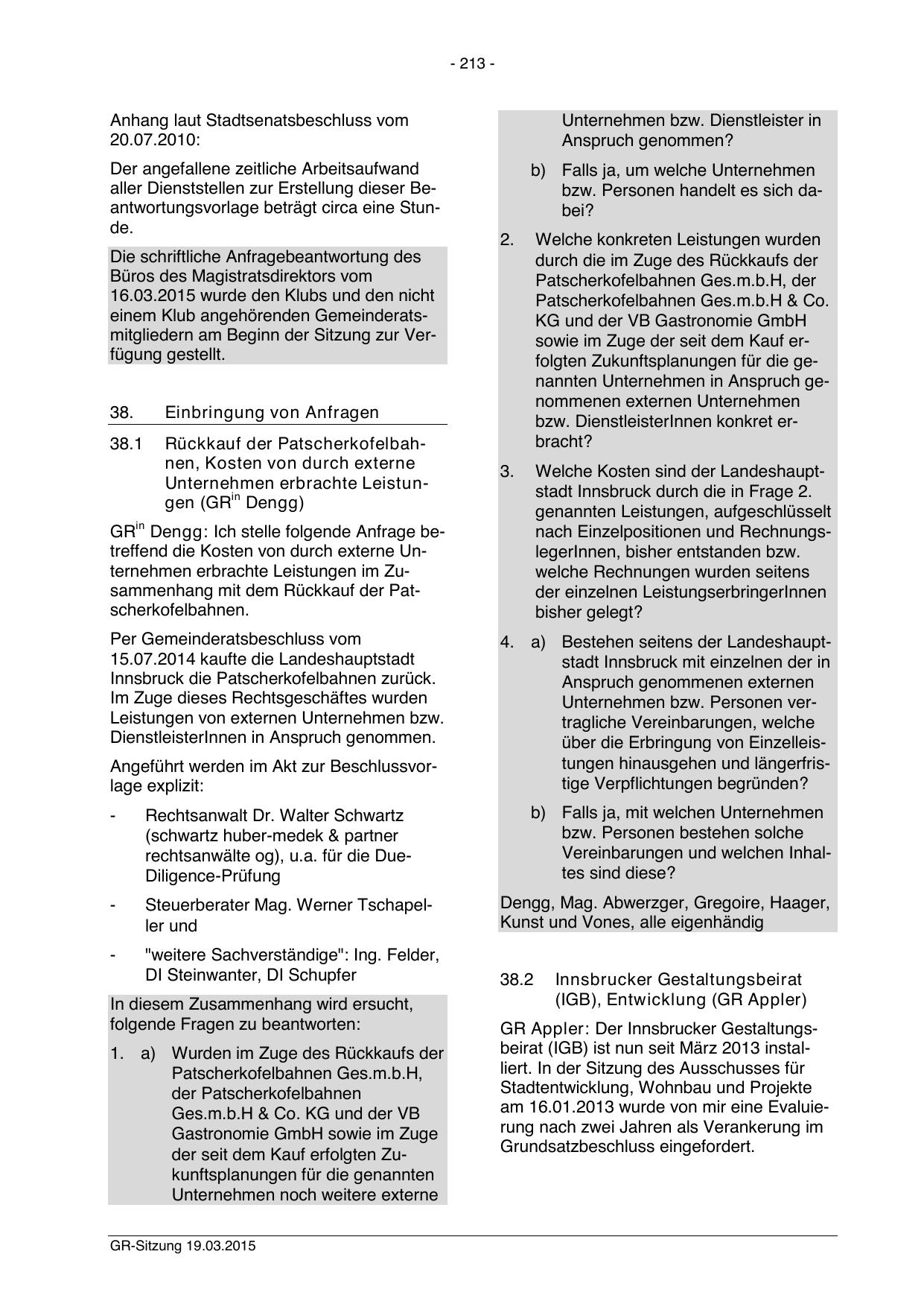GRin Dengg: Ich stelle folgende Anfrage betreffend die Kosten von durch externe Unternehmen erbrachte Leistungen im Zusammenhang mit dem Rückkauf der Patscherkofelbahnen.