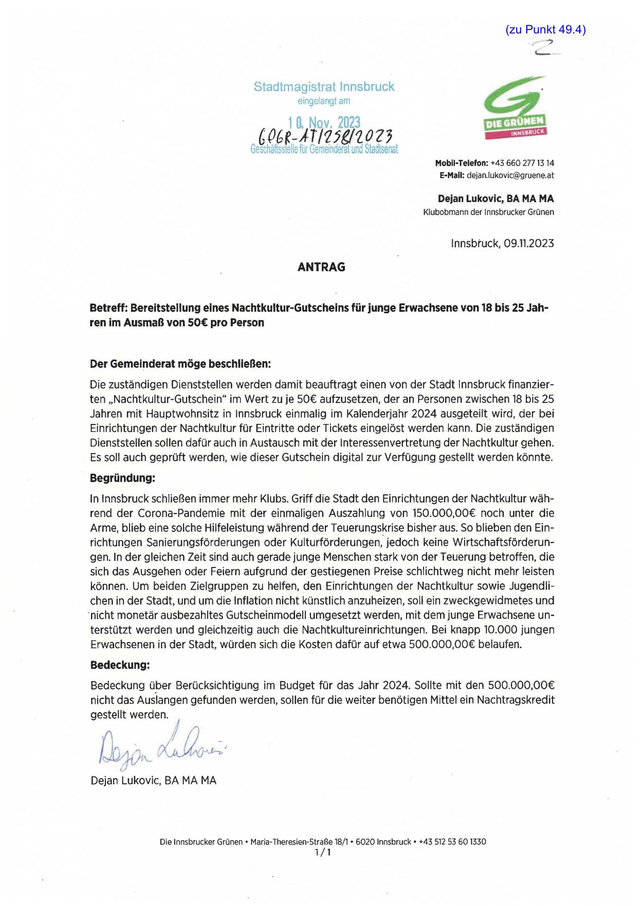 Die zuständigen Dienststellen werden damit beauftragt einen von der Stadt Innsbruck finanzierten „Nachtkultur-Gutschein" im Wert zu je 50€ aufzusetzen, der an Personen zwischen 18 bis 25
