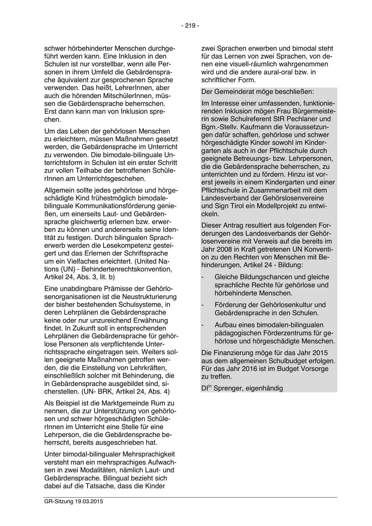 Lehrplänen die Gebärdensprache für gehörlose Personen als verpflichtende Unterrichtssprache eingetragen sein. Weiters sollen geeignete Maßnahmen getroffen werden, die die Einstellung von Lehrkräften,