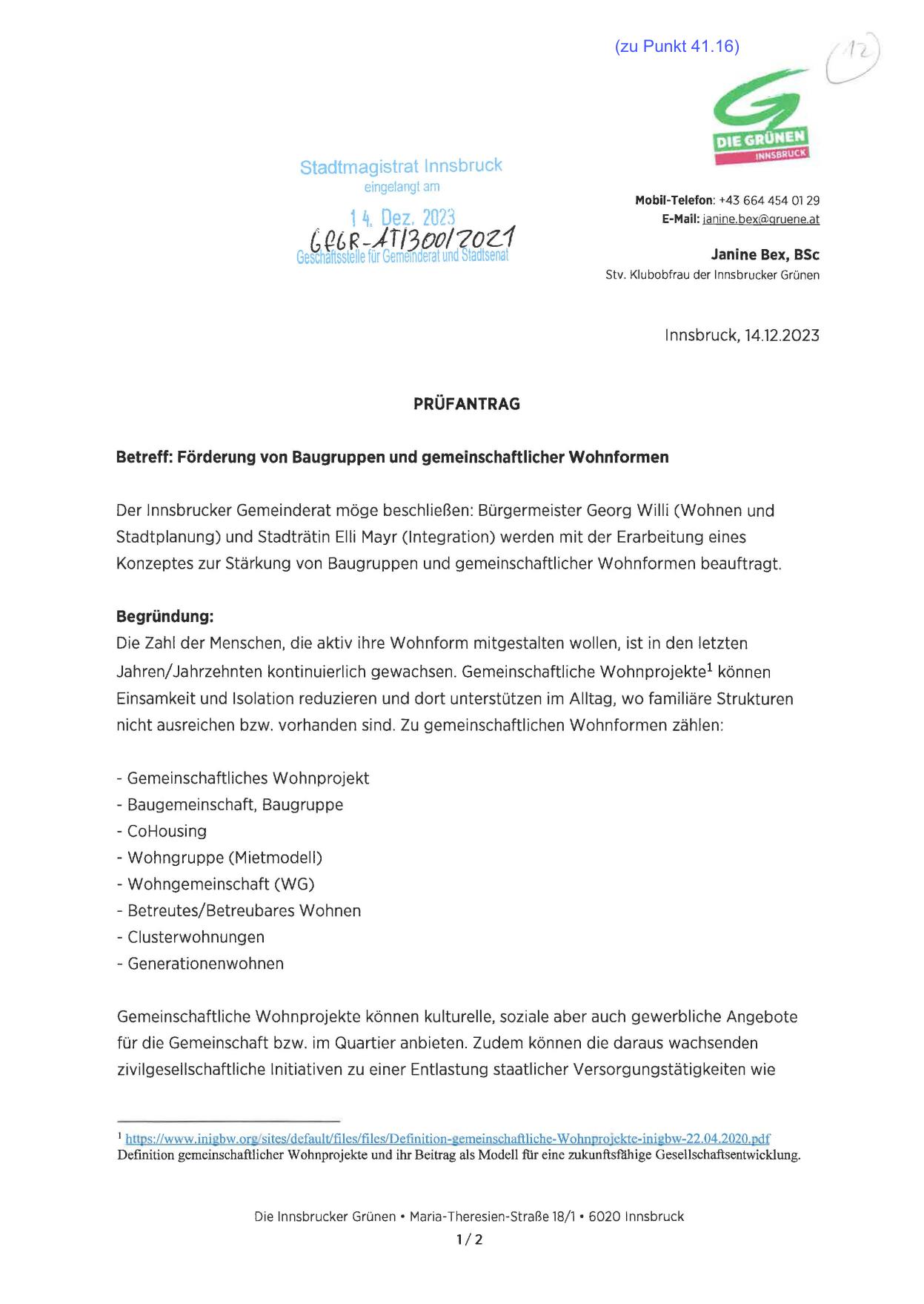 Der lnnsbrucker Gemeinderat möge beschließen: Bürgermeister Georg Willi (Wohnen und
