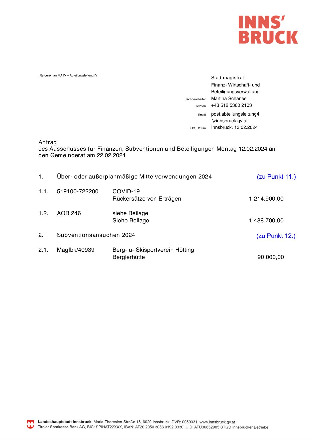 W Tiroler Sparkasse Bank AG, BIC: SPIHAT22XXX, IBAN: AT20 2050 3033 0192 0330, UID: ATU36832905 STGD Innsbrucker Betriebe