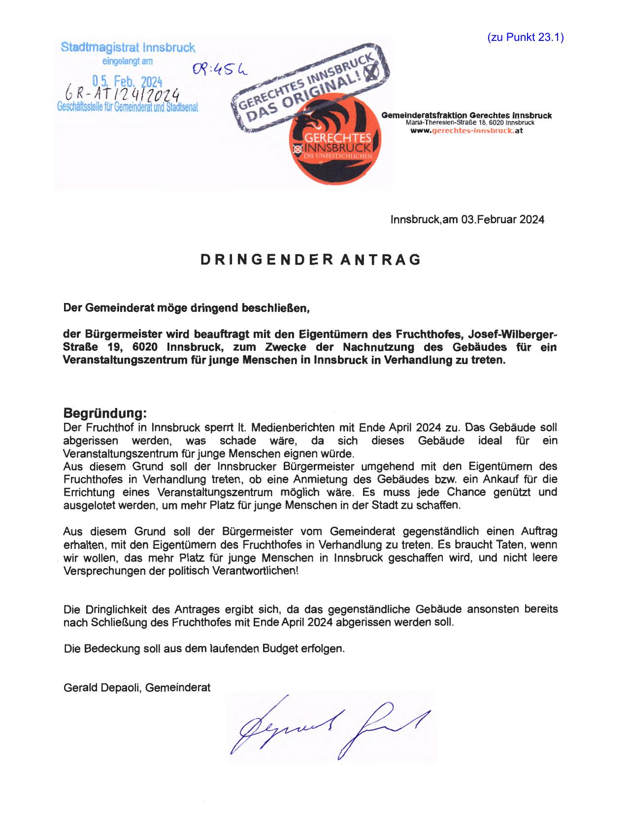 der Bürgermeister wird beauftragt mit den Eigentümern des Fruchthofes, Josef-WilbergerStraße 19, 6020 Innsbruck, zum Zwecke der Nachnutzung des Gebäudes für ein