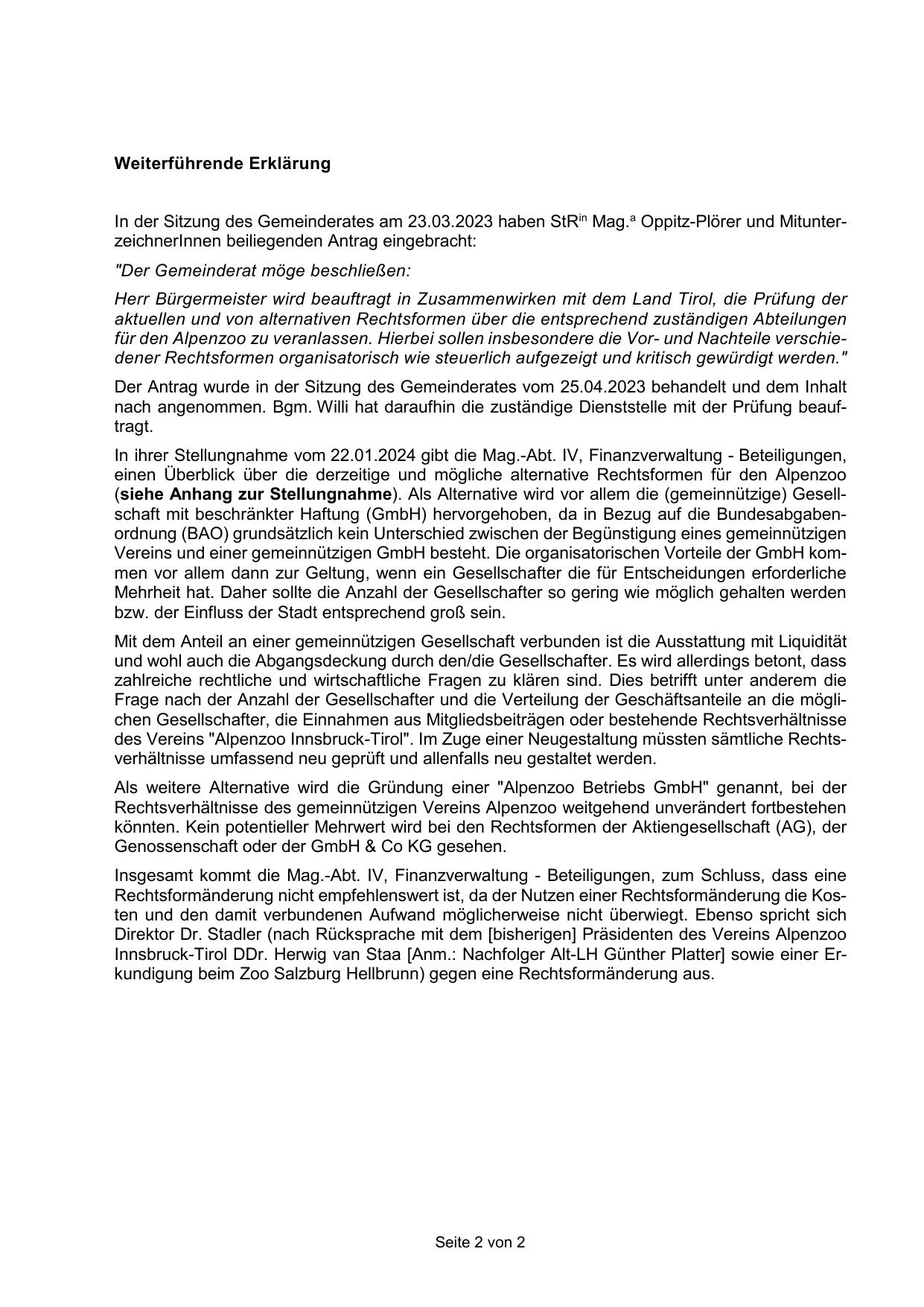 des Vereins "Alpenzoo Innsbruck-Tirol". Im Zuge einer Neugestaltung müssten sämtliche Rechtsverhältnisse umfassend neu geprüft und allenfalls neu gestaltet werden.