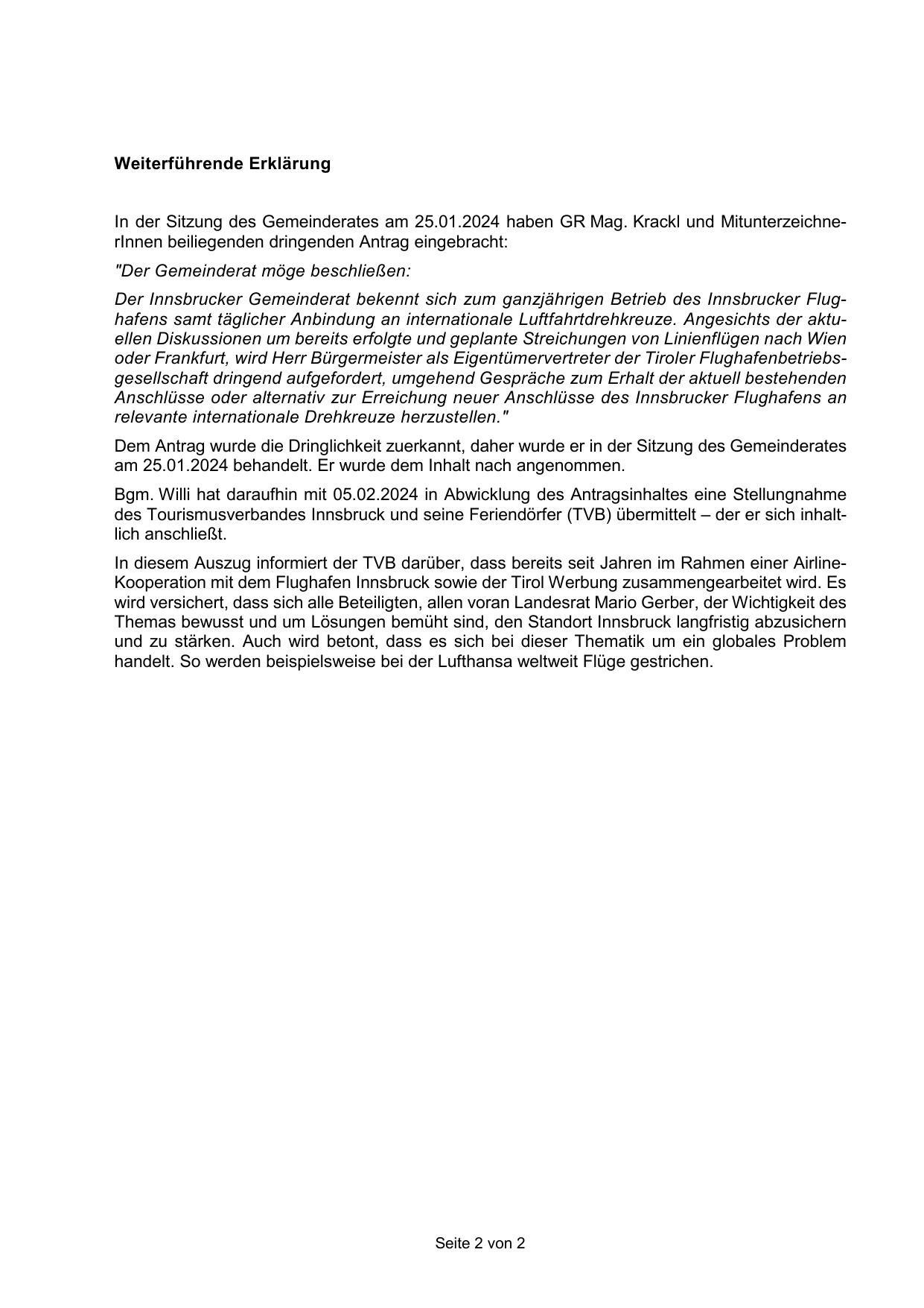 Der Innsbrucker Gemeinderat bekennt sich zum ganzjährigen Betrieb des Innsbrucker Flughafens samt täglicher Anbindung an internationale Luftfahrtdrehkreuze. Angesichts der aktuellen Diskussionen um bereits erfolgte und geplante Streichungen von Linienflügen nach Wien