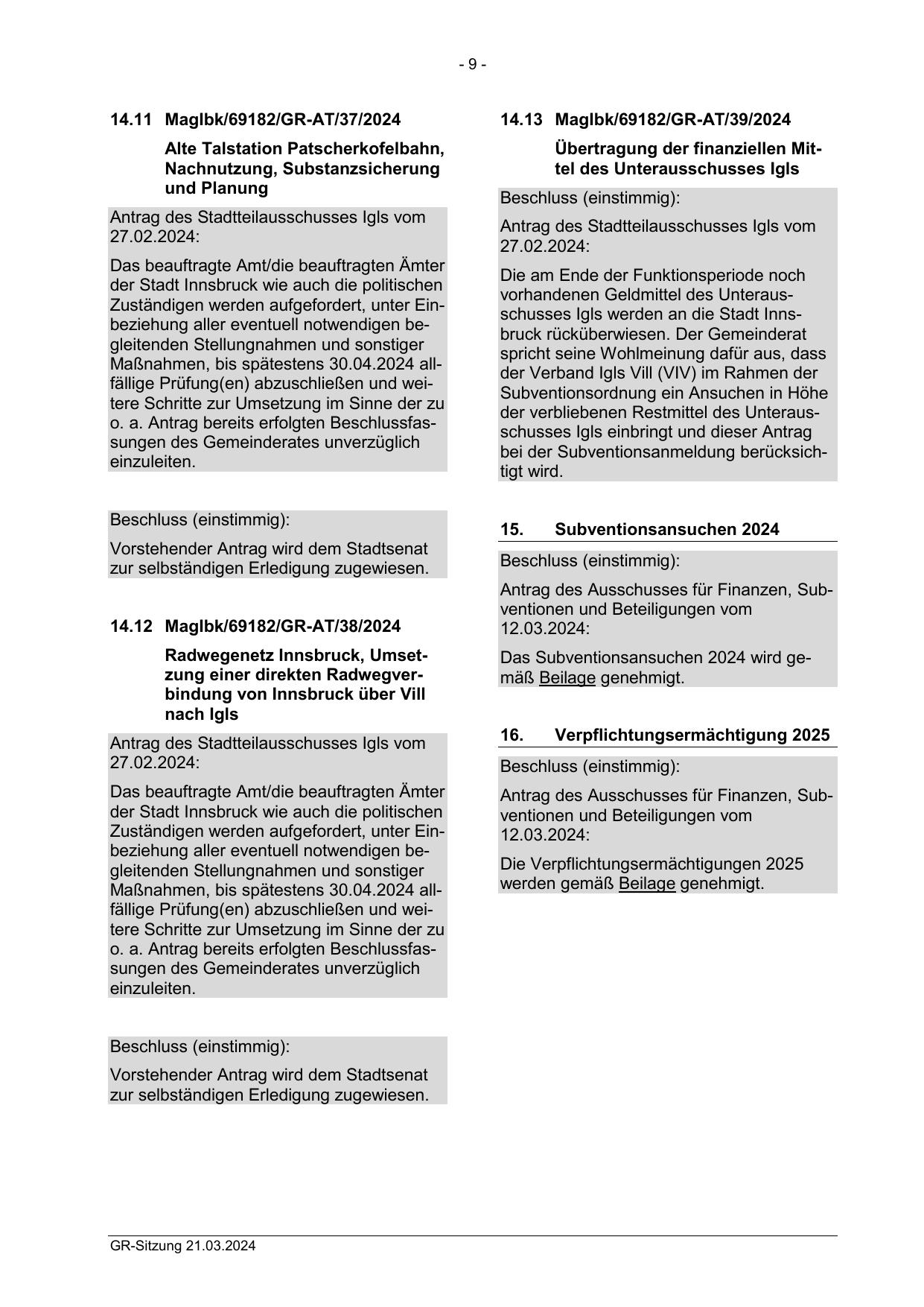 vorhandenen Geldmittel des Unterausschusses Igls werden an die Stadt Innsbruck rücküberwiesen. Der Gemeinderat