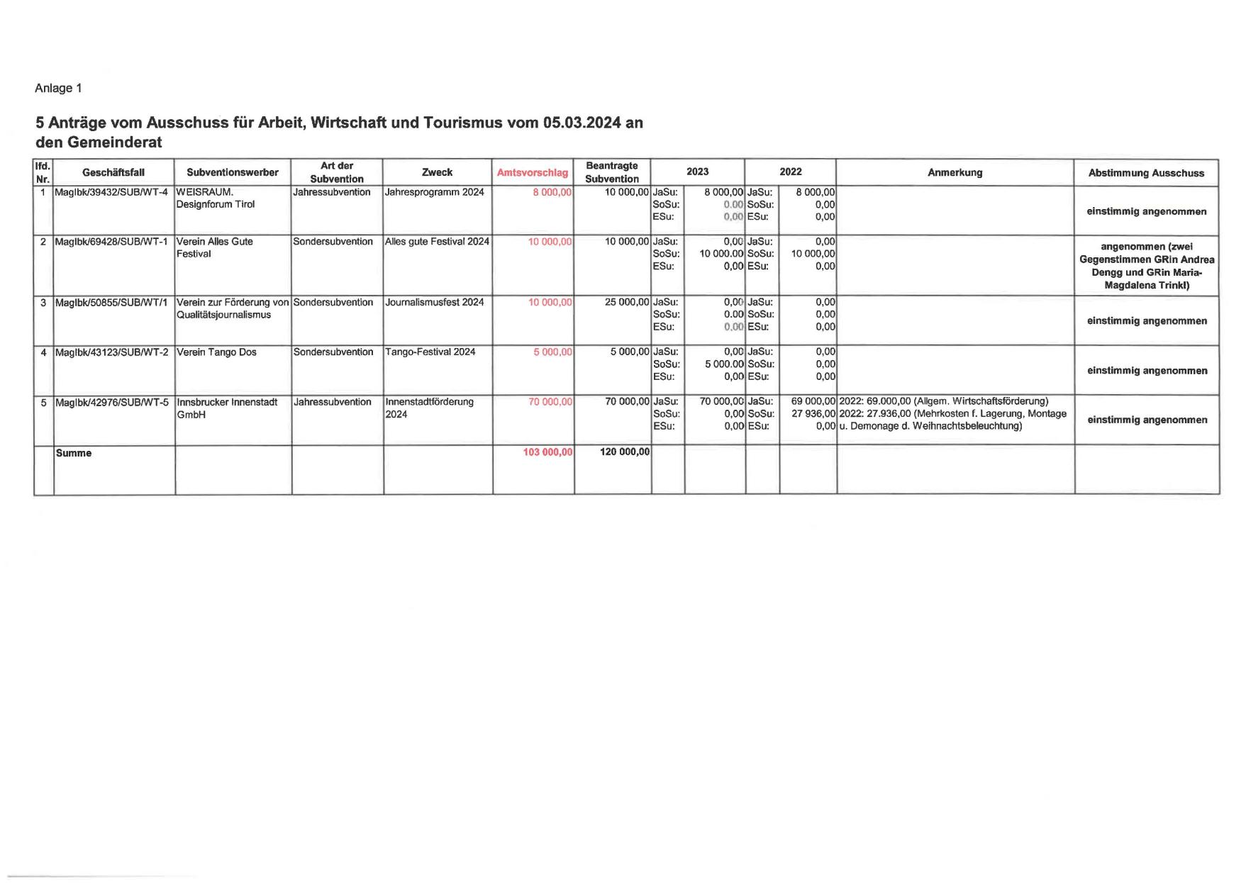 5 Anträge vom Ausschuss für Arbeit, Wirtschaft und Tourismus vom 05.03.2024 an