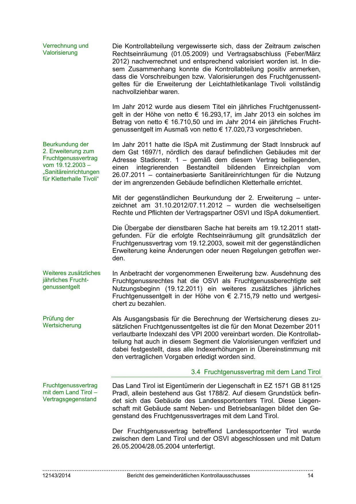 dass die Vorschreibungen bzw. Valorisierungen des Fruchtgenussentgeltes für die Erweiterung der Leichtathletikanlage Tivoli vollständig